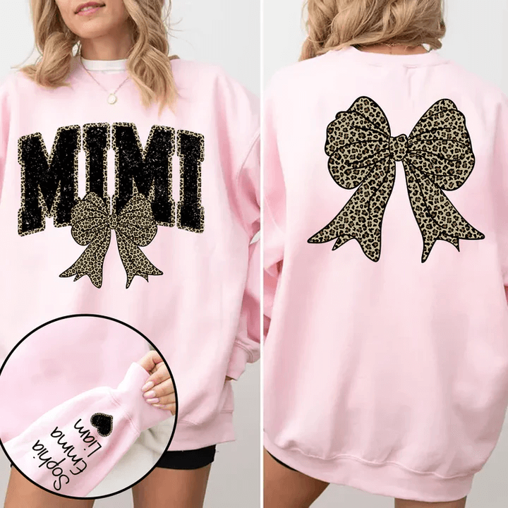 Black Mimi Leopard Bow – Personalized Sweatshirt With Design On Sleeve – Gift For Grandma, Mom, Wife