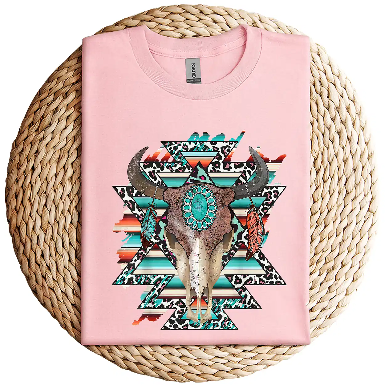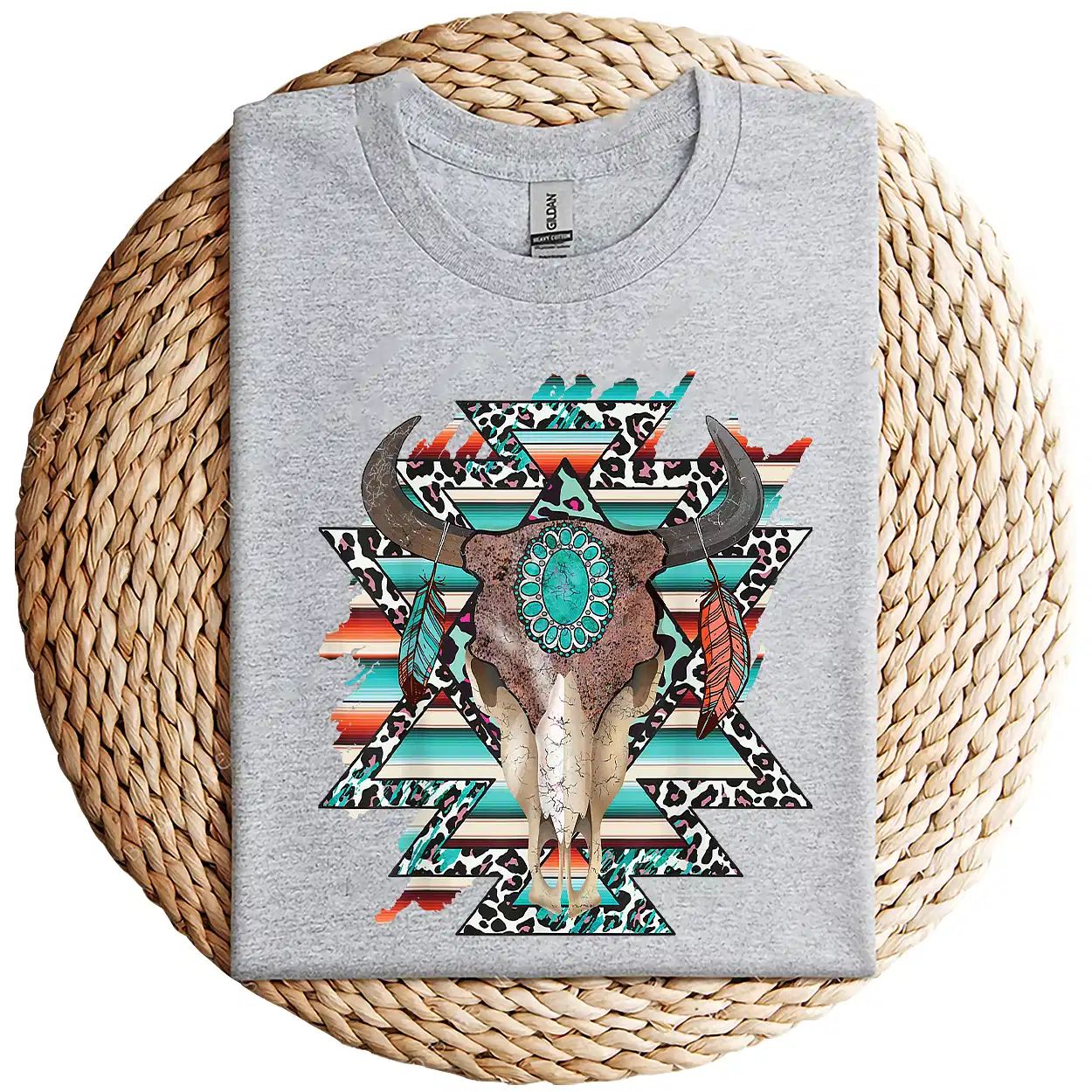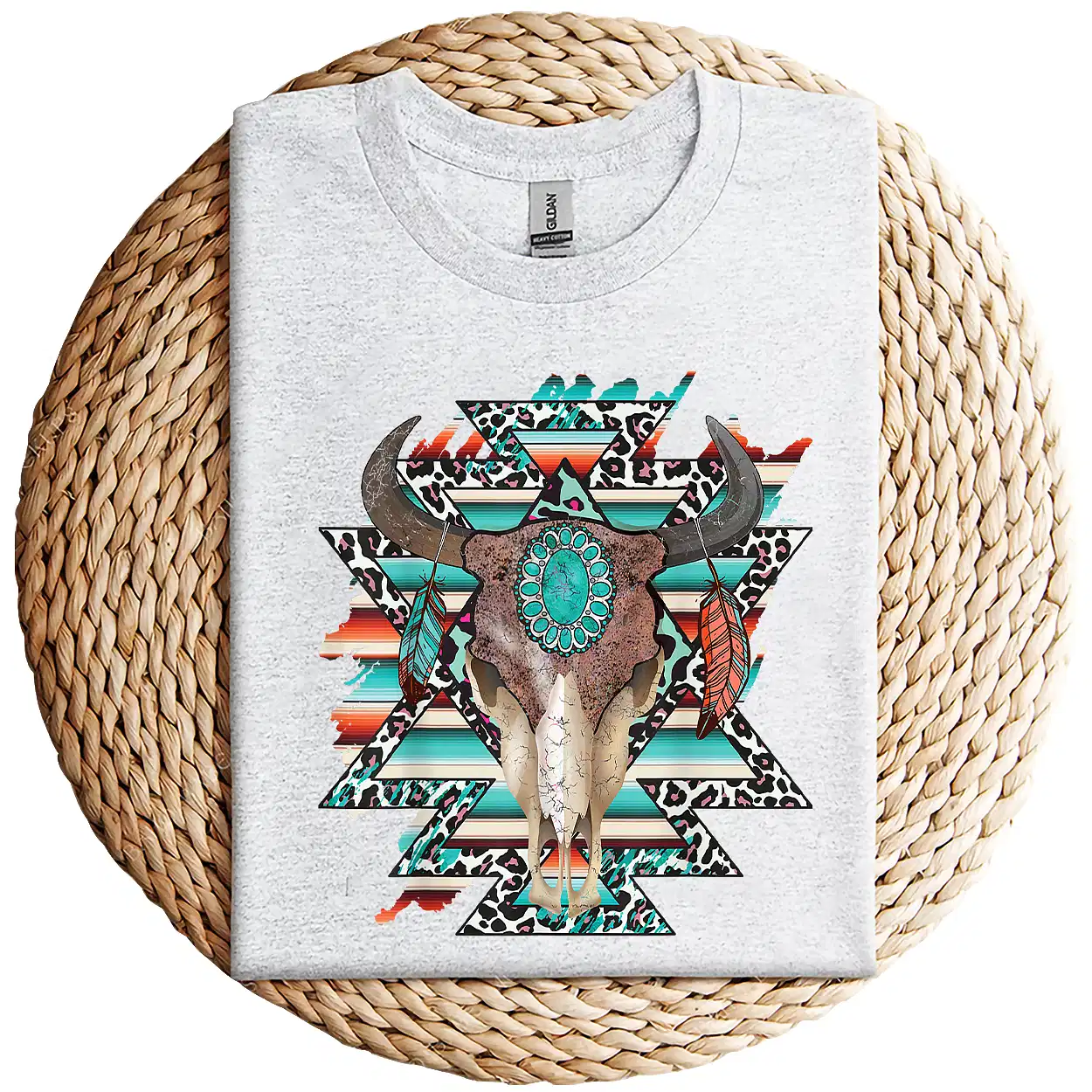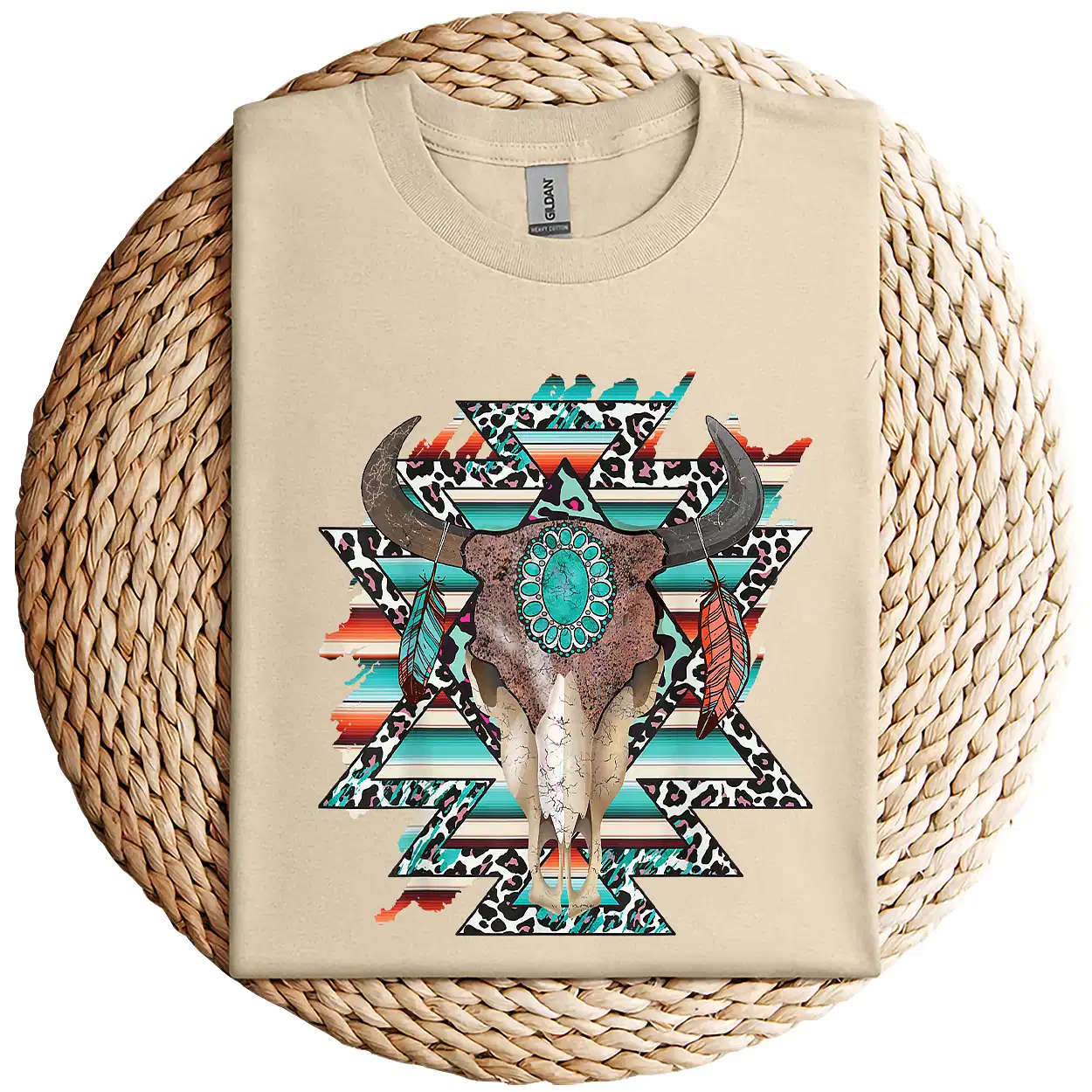 Boho Serape Turquoise Aztec Cow Skull T-Shirt – Western Cowgirl Graphic Tee – Vintage Bull Skull Rodeo Shirt – Country Outfit Top