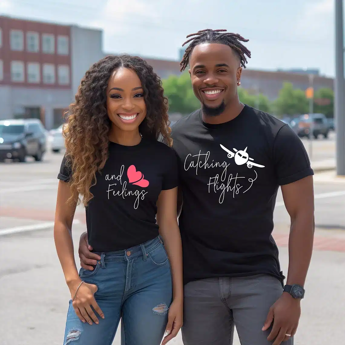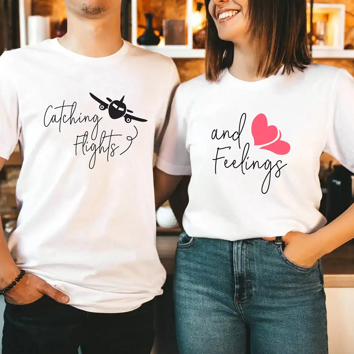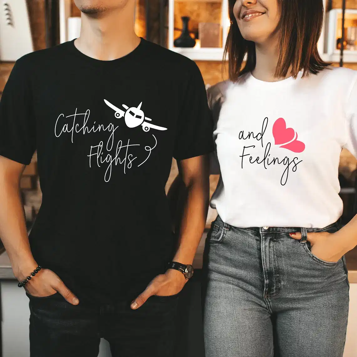 Couple Matching T-Shirt With Catching Flights and Feelings Print Design, The Best Family Matching Gift