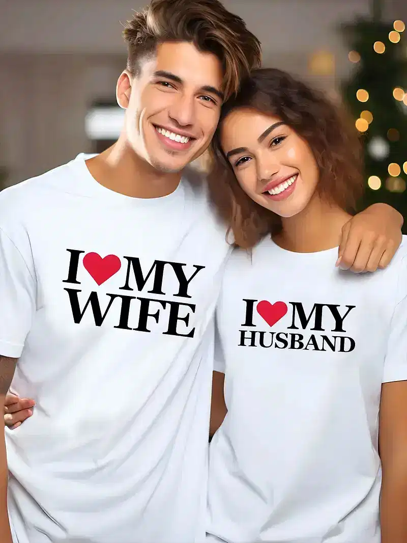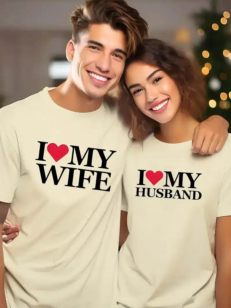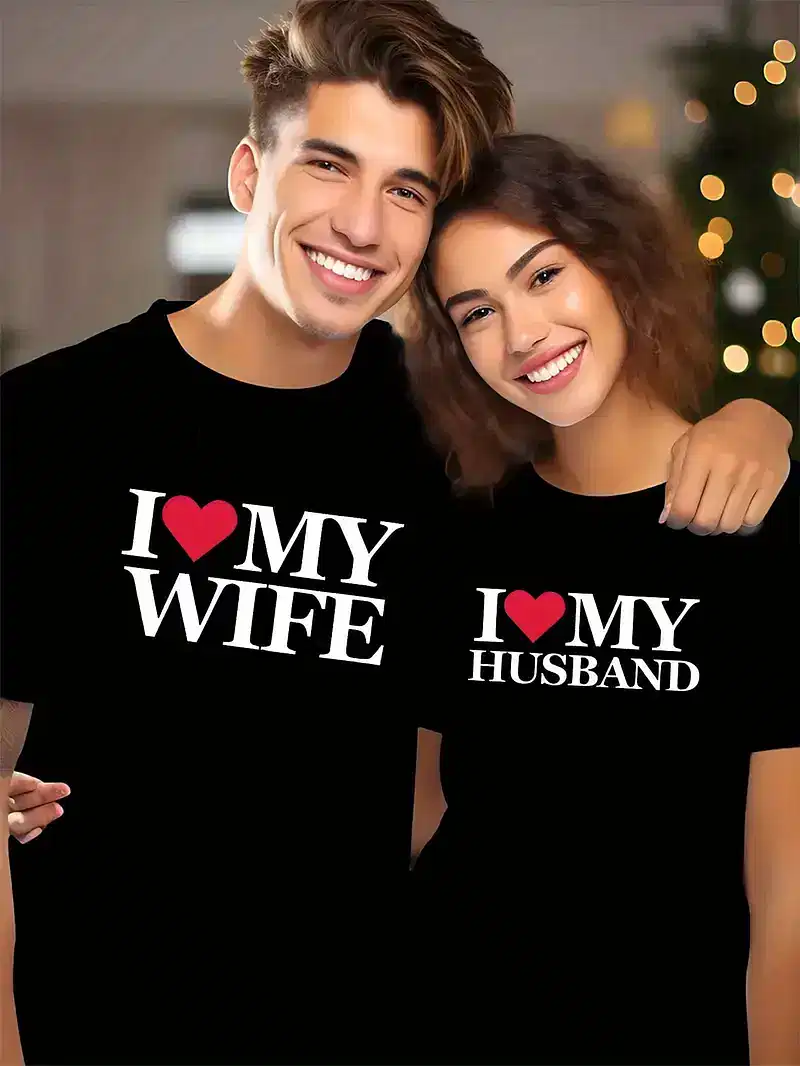 I Love My Wife, I Love My Husband, Couple’S Letter Pattern T-Shirt, Newlywed Couple Gift, Matching Couple, Husband And Wife, Bride And Groom