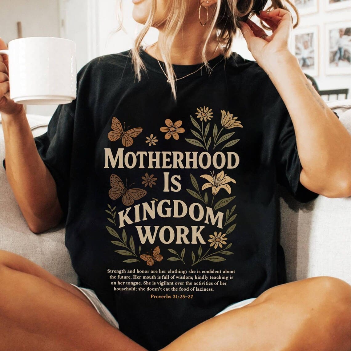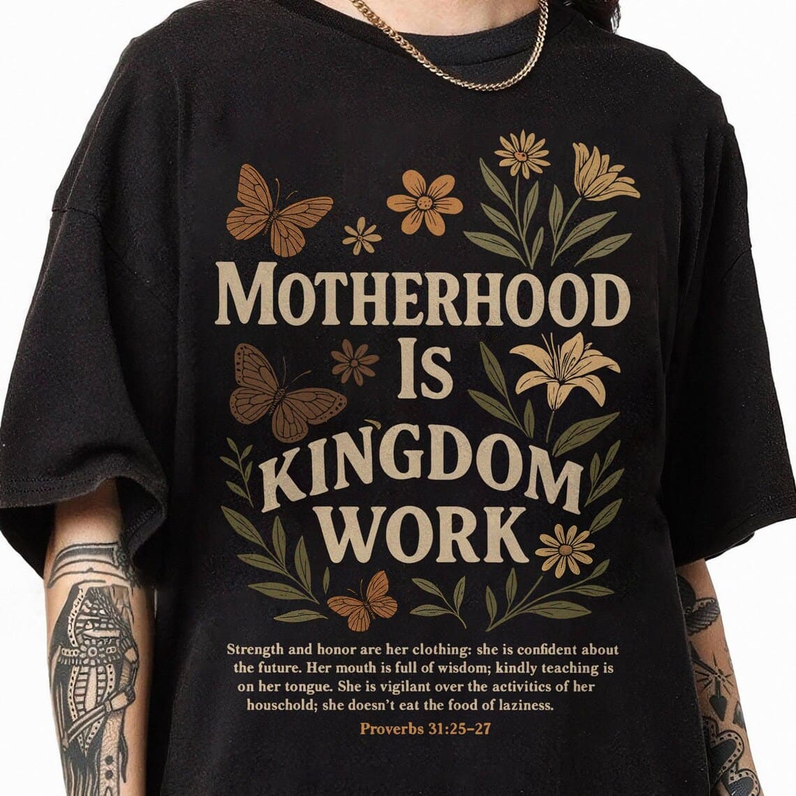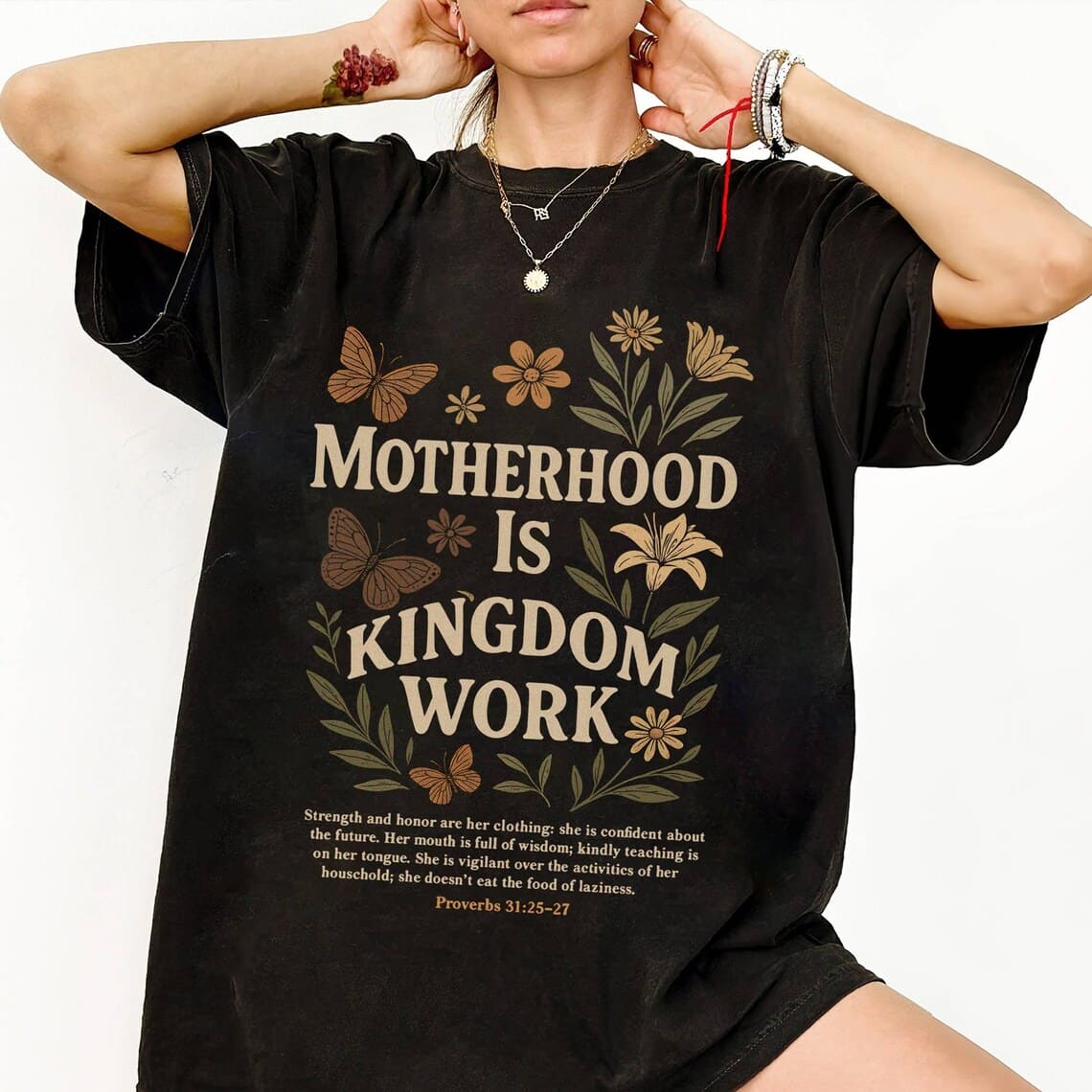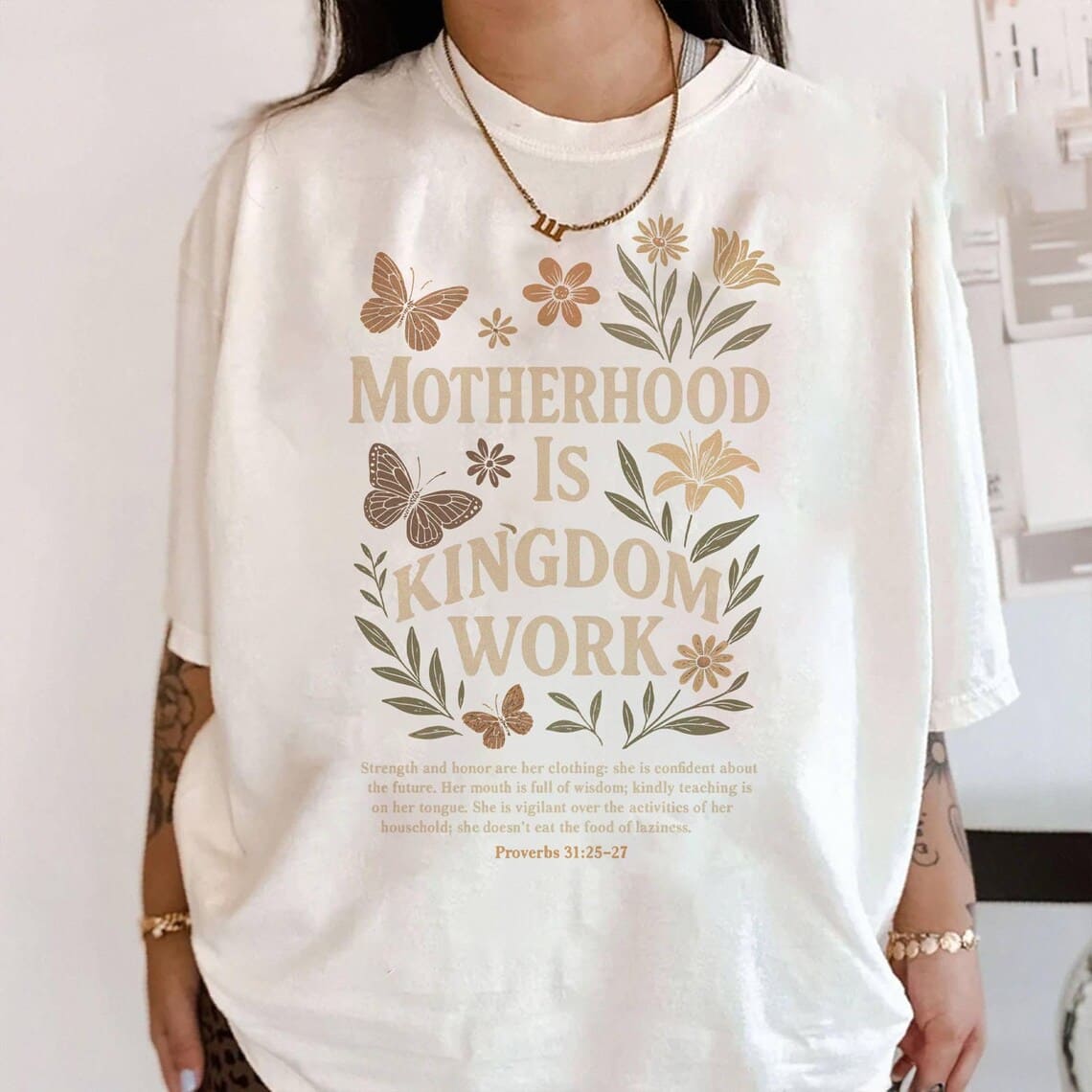 Motherhood Is Kingdom Work Tee, Retro Christian Mom Shirt for Mother’s Day, Faith-Based Mom Life Shirt