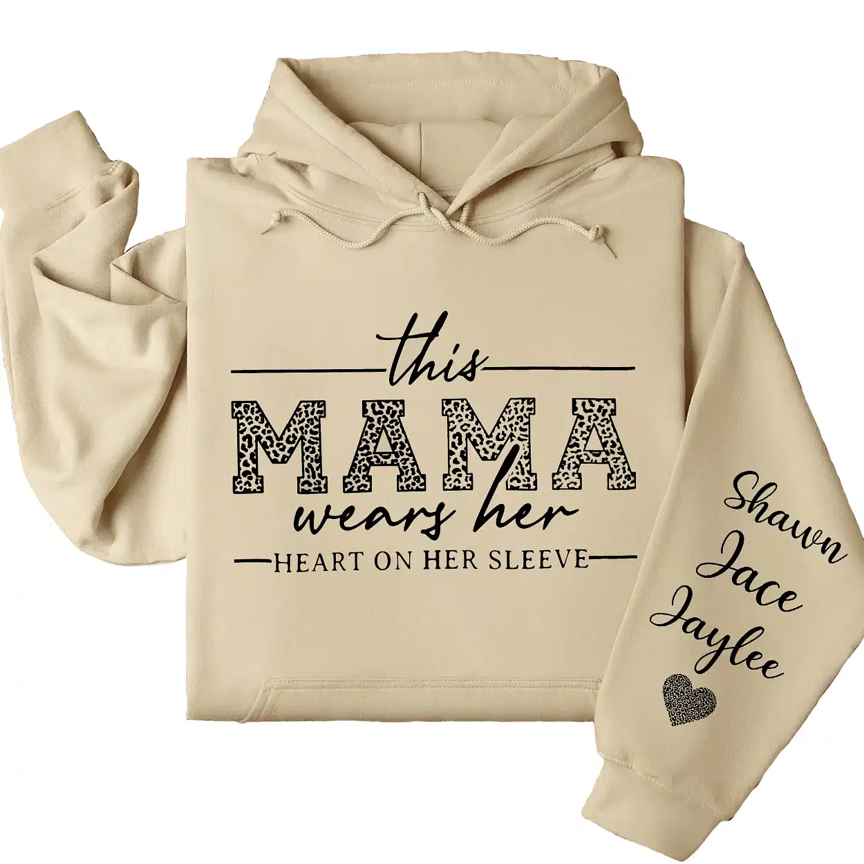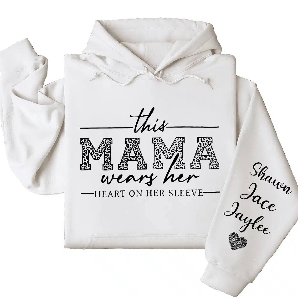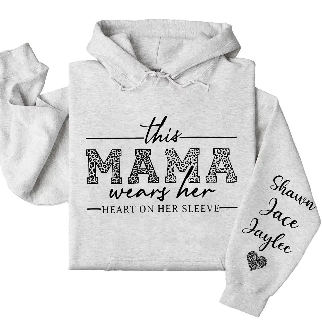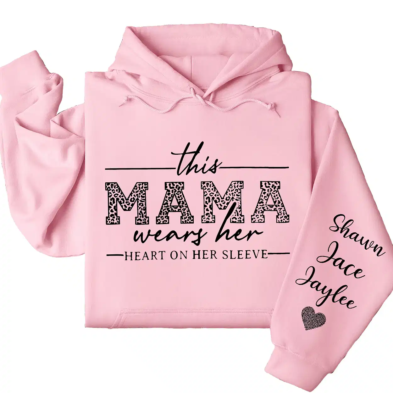 Personalized This Mama Wears Her Heart on Her Sleeve Hoodie – Mom Life, Blessed Mama, Motherhood Hoodie – Mother’s Day Gift