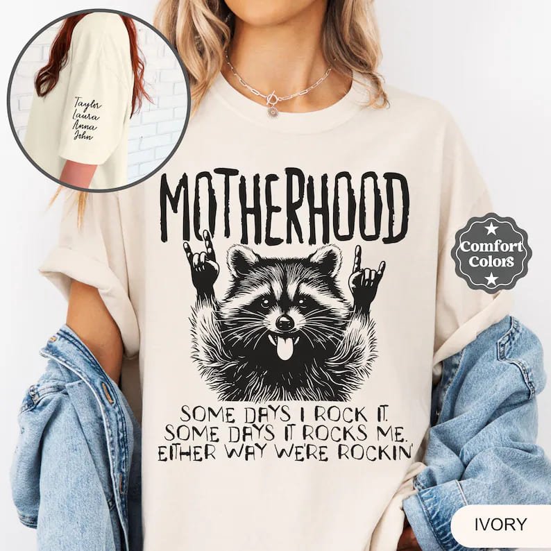Raccoon Motherhood, Motherhood Some Day I Rock It Shirt, Rocker Mom With Kids Names, Custom Mothers Day T-Shirt, Happy Mother’s Day, The Best Gift for Women