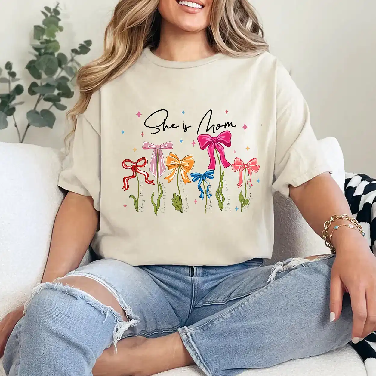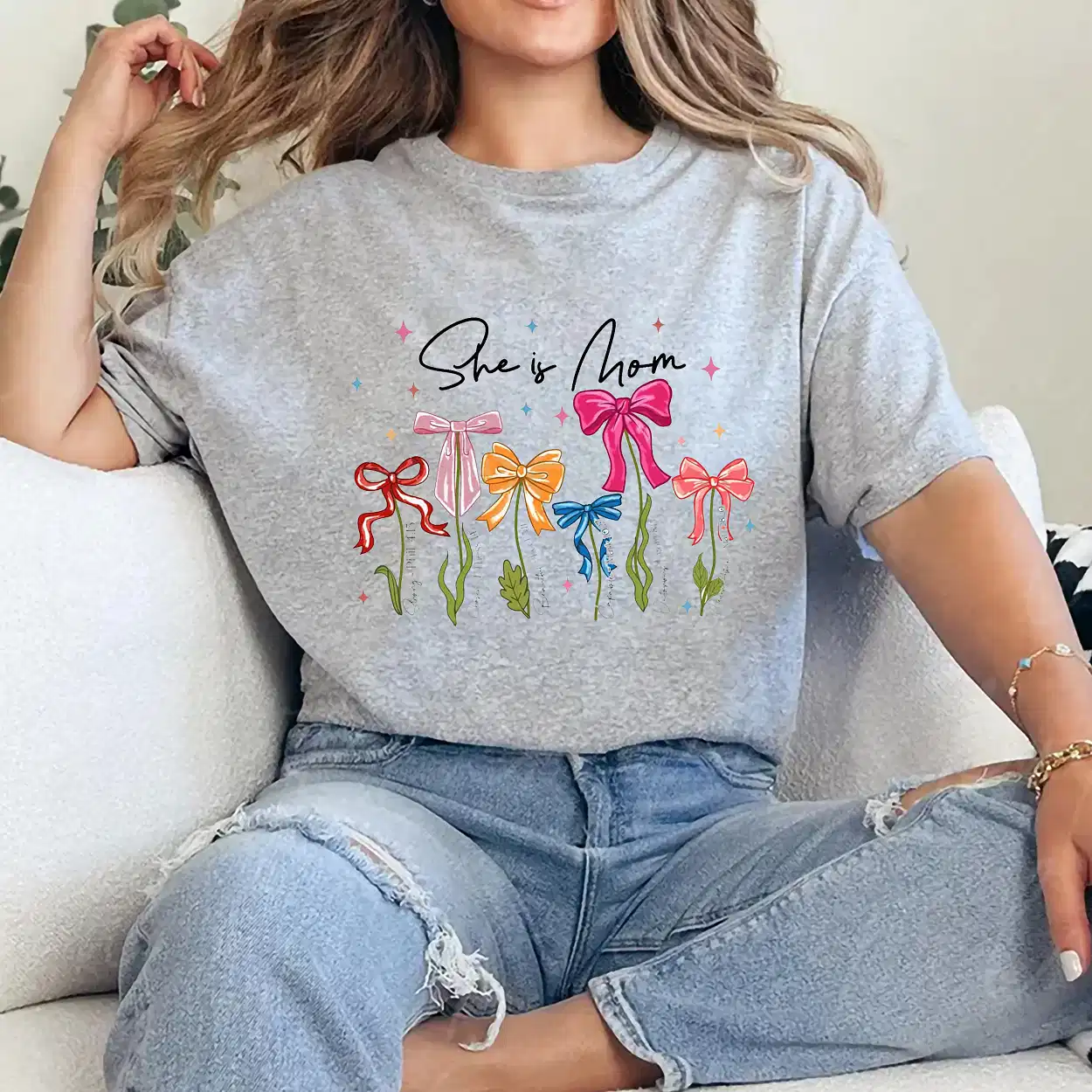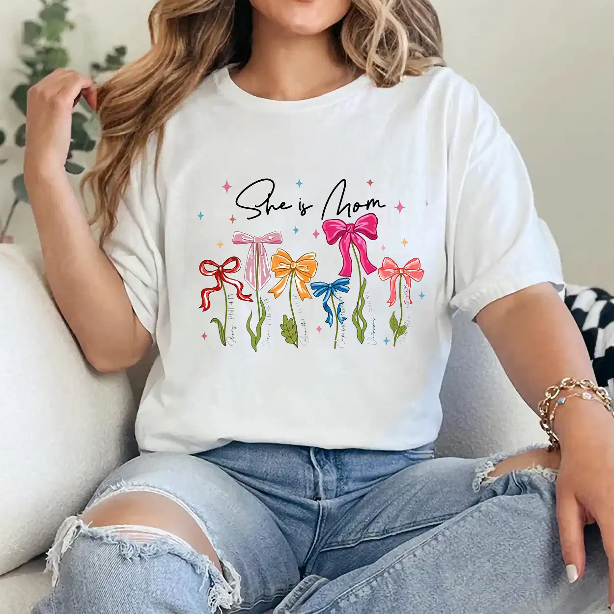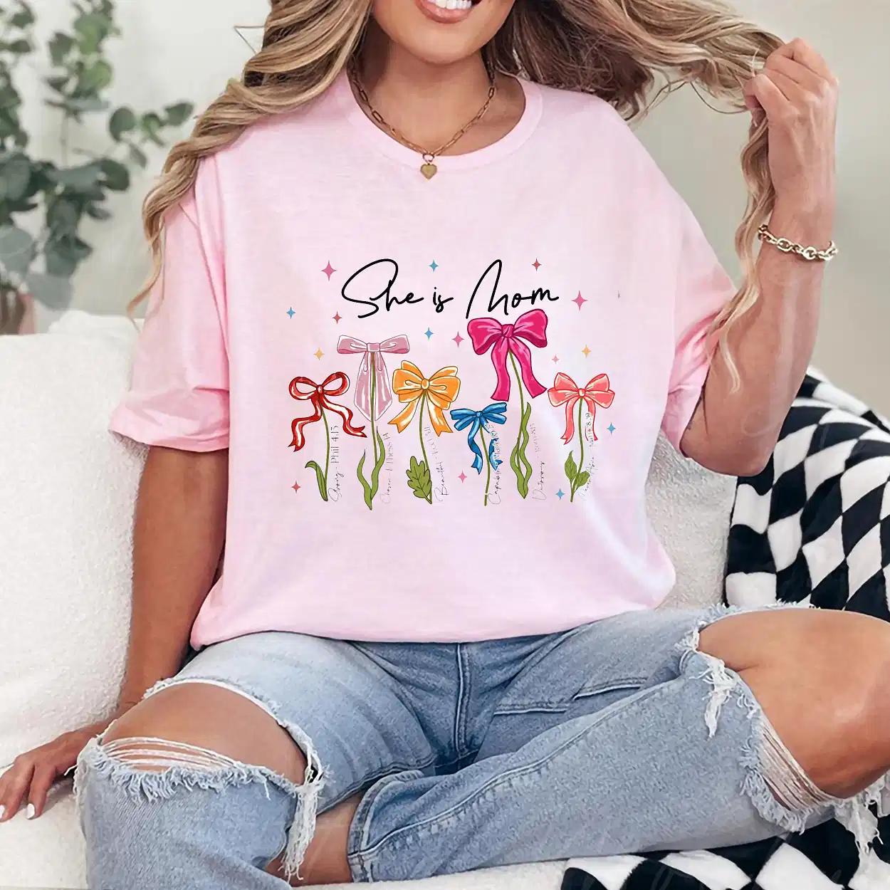She Is Mom T-Shirt – Retro Coquette Bow Christian Mom Shirt, Bible Verse ‘She Is Strong’ Tee, Cute Mother’s Day Gift for Faithful Mama