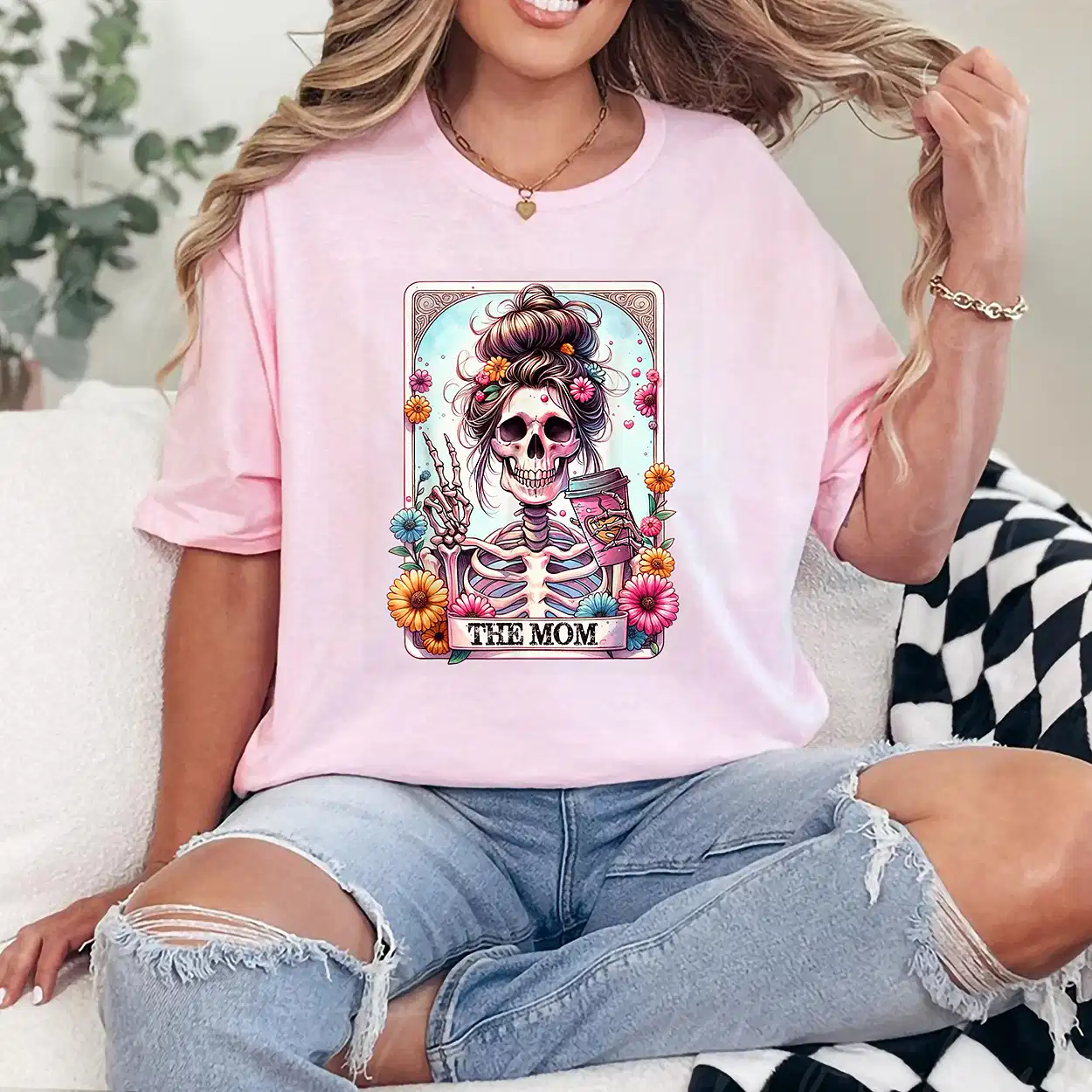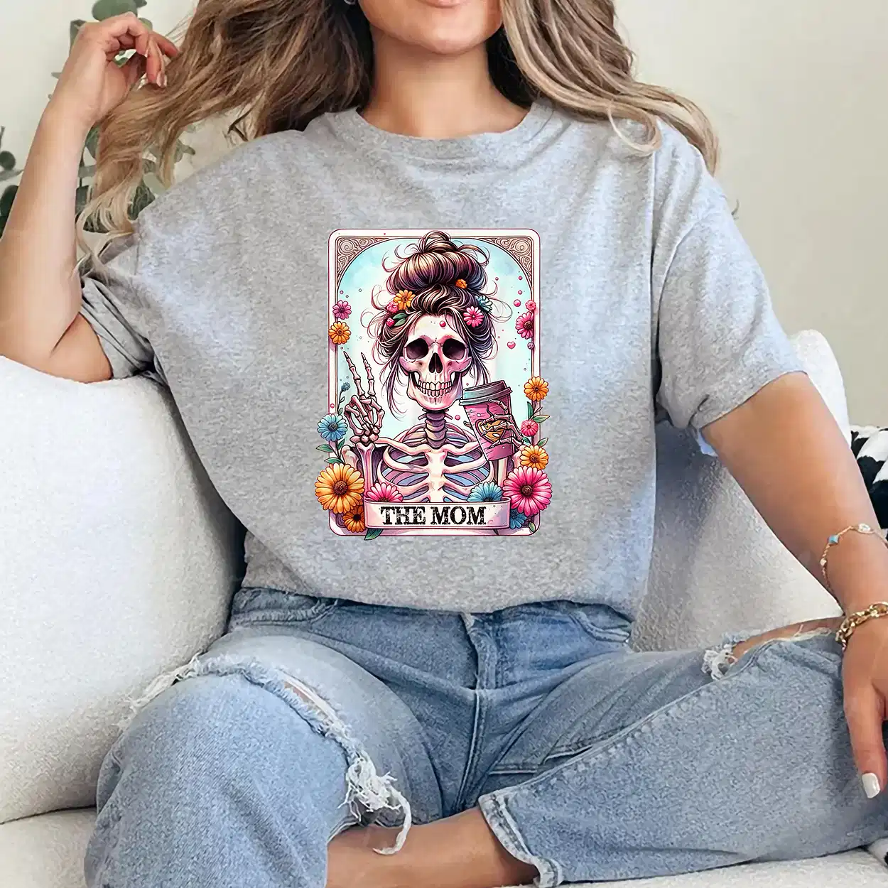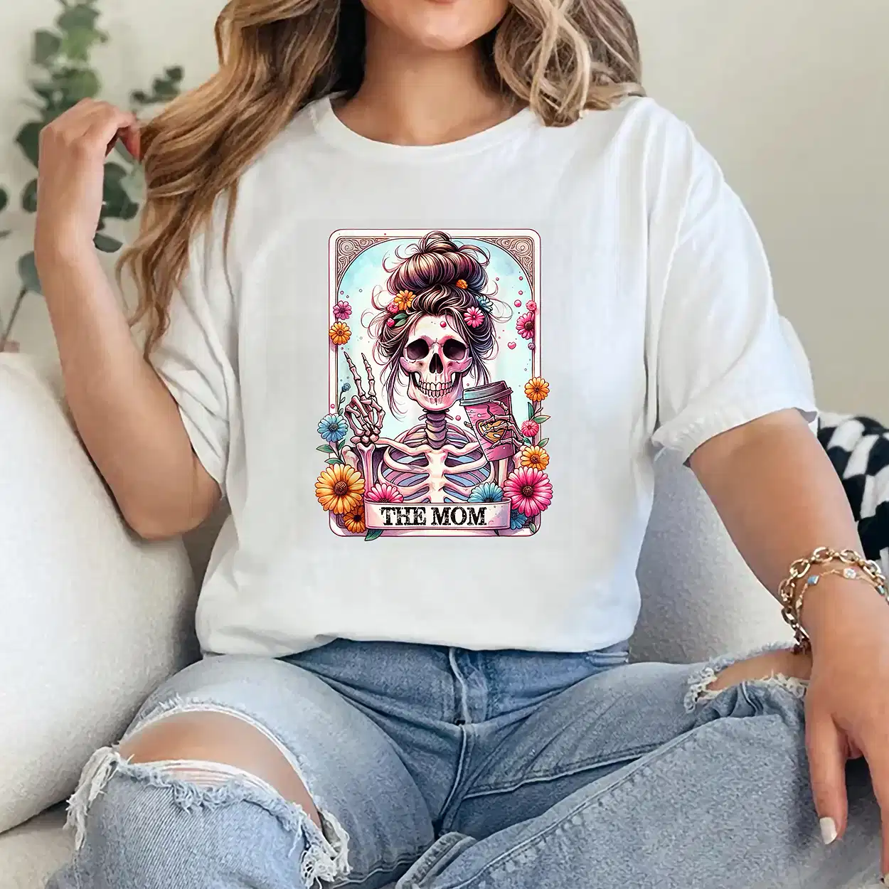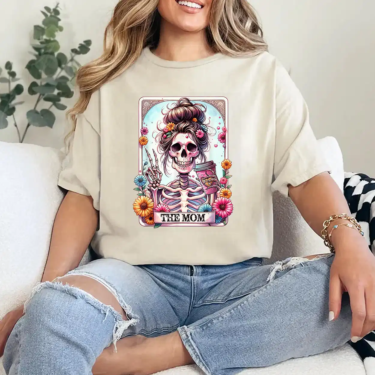 The Mom Funny Tarot Card Messy Bun Coffee Skeleton Mama T-Shirt – Unisex, Gift for Halloween Day, Gift for Mama