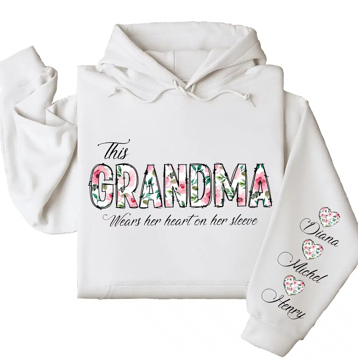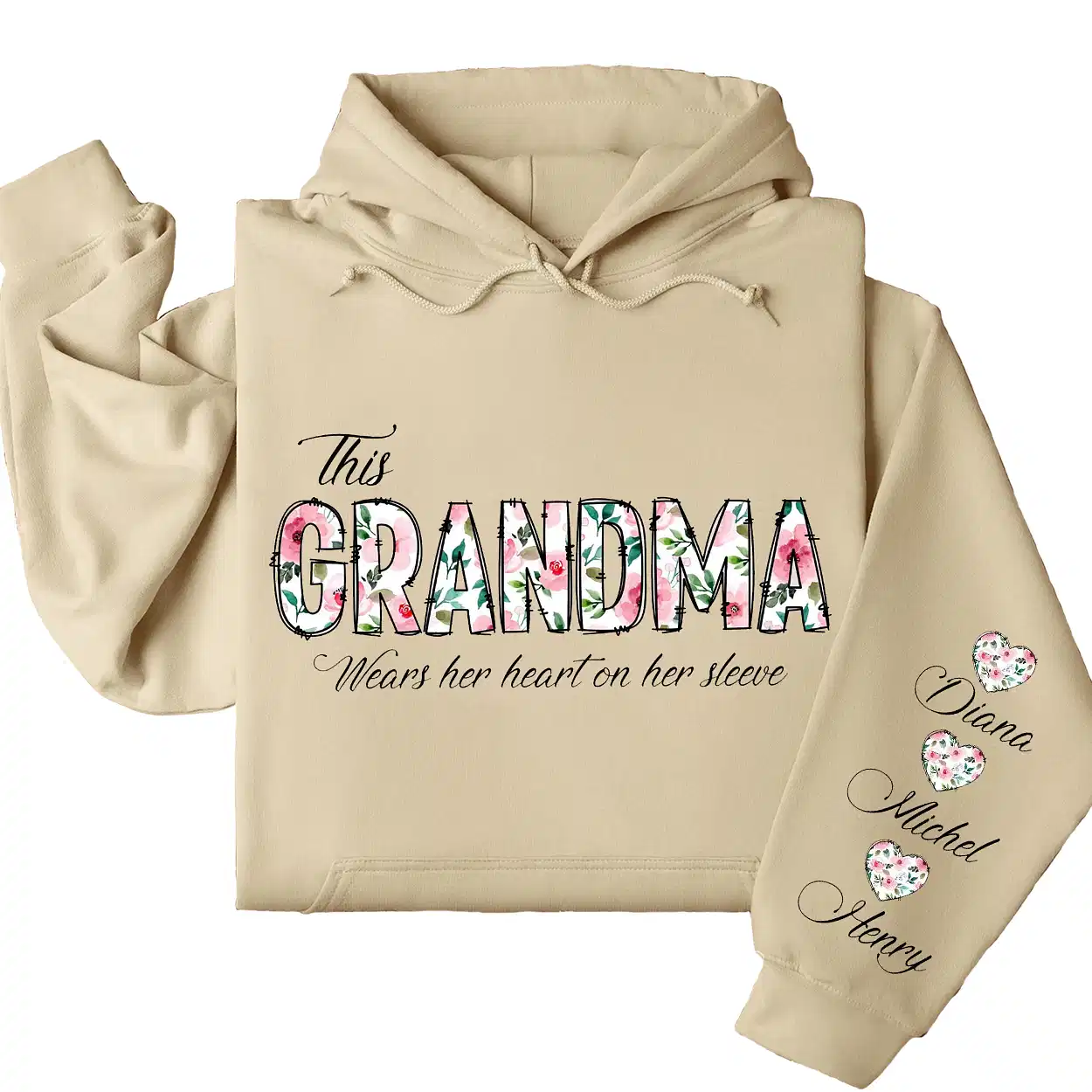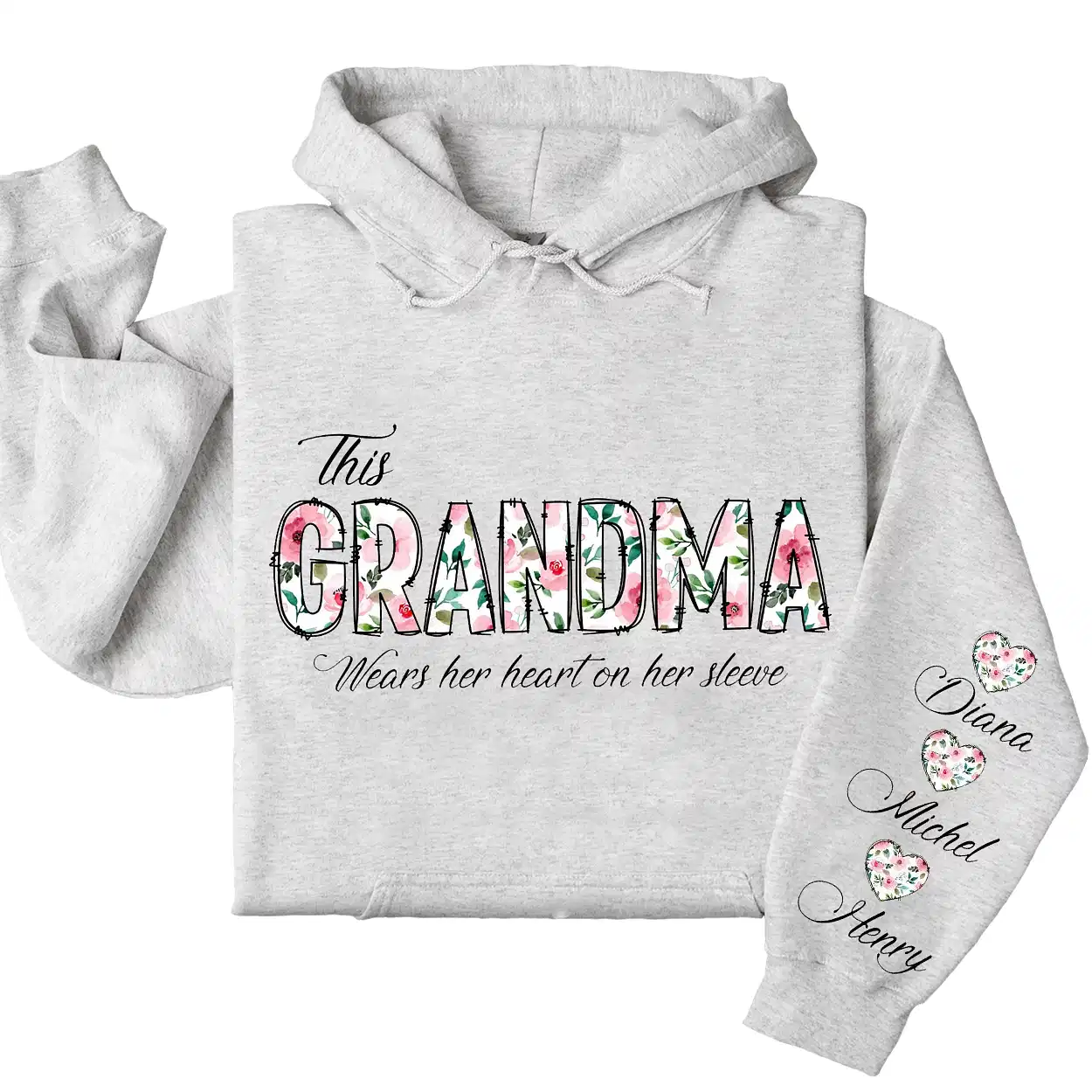 This Grandma Wears Her Heart on Her Sleeve Hoodie – Custom Hoodie with Kids’ Names, Personalized Mother’s Day Gift for Grandma