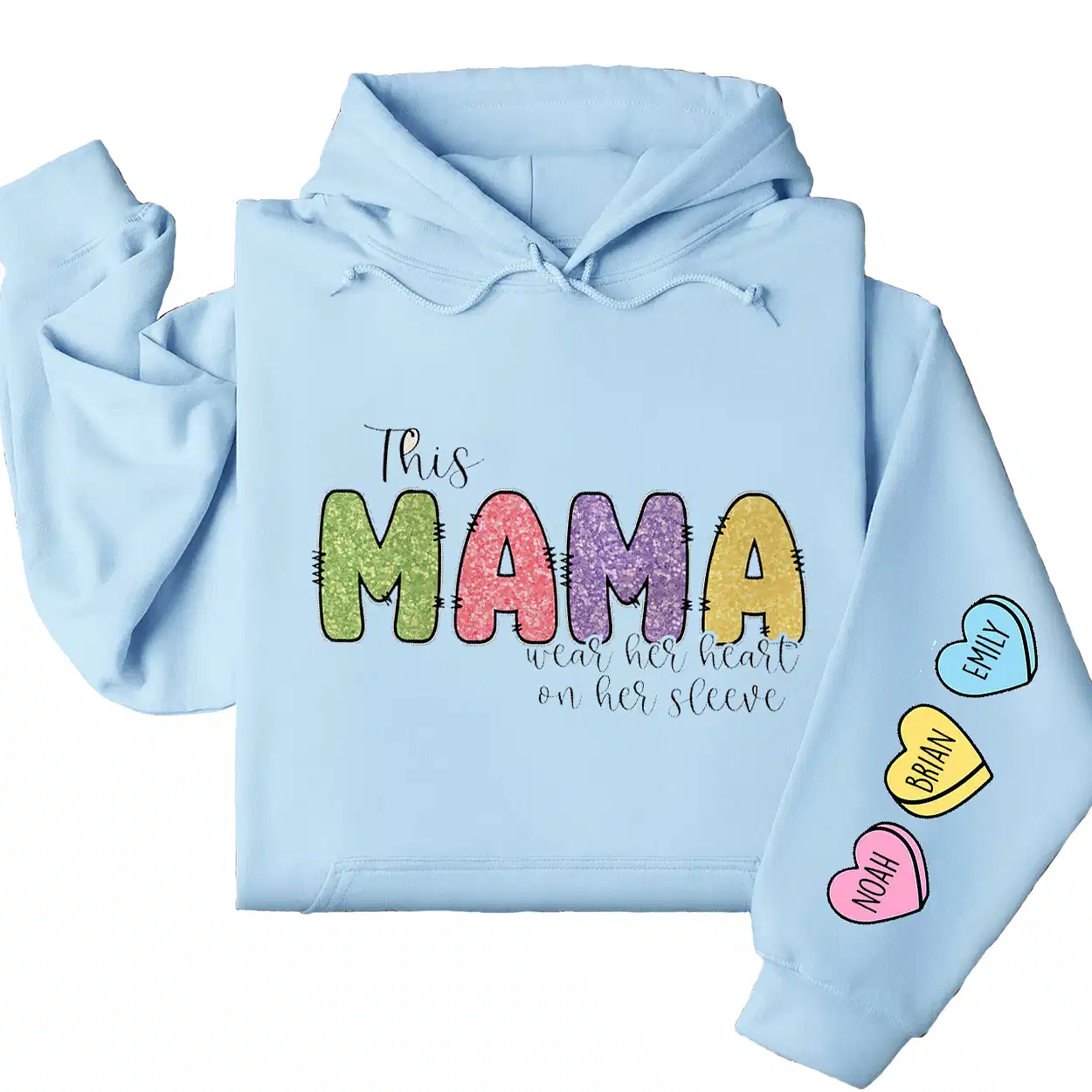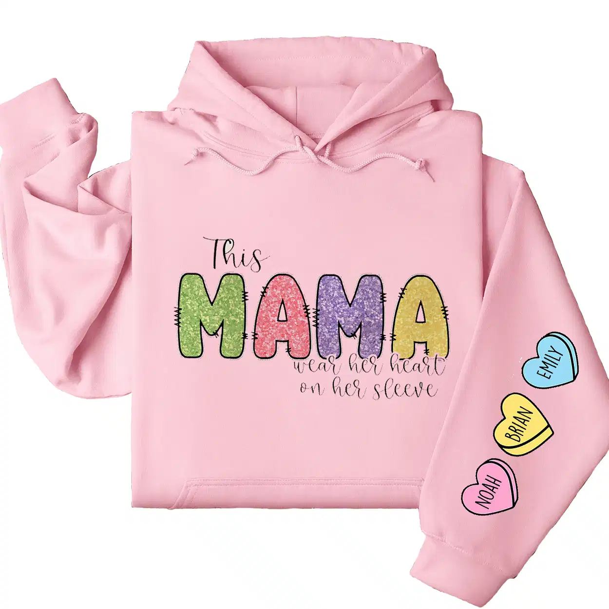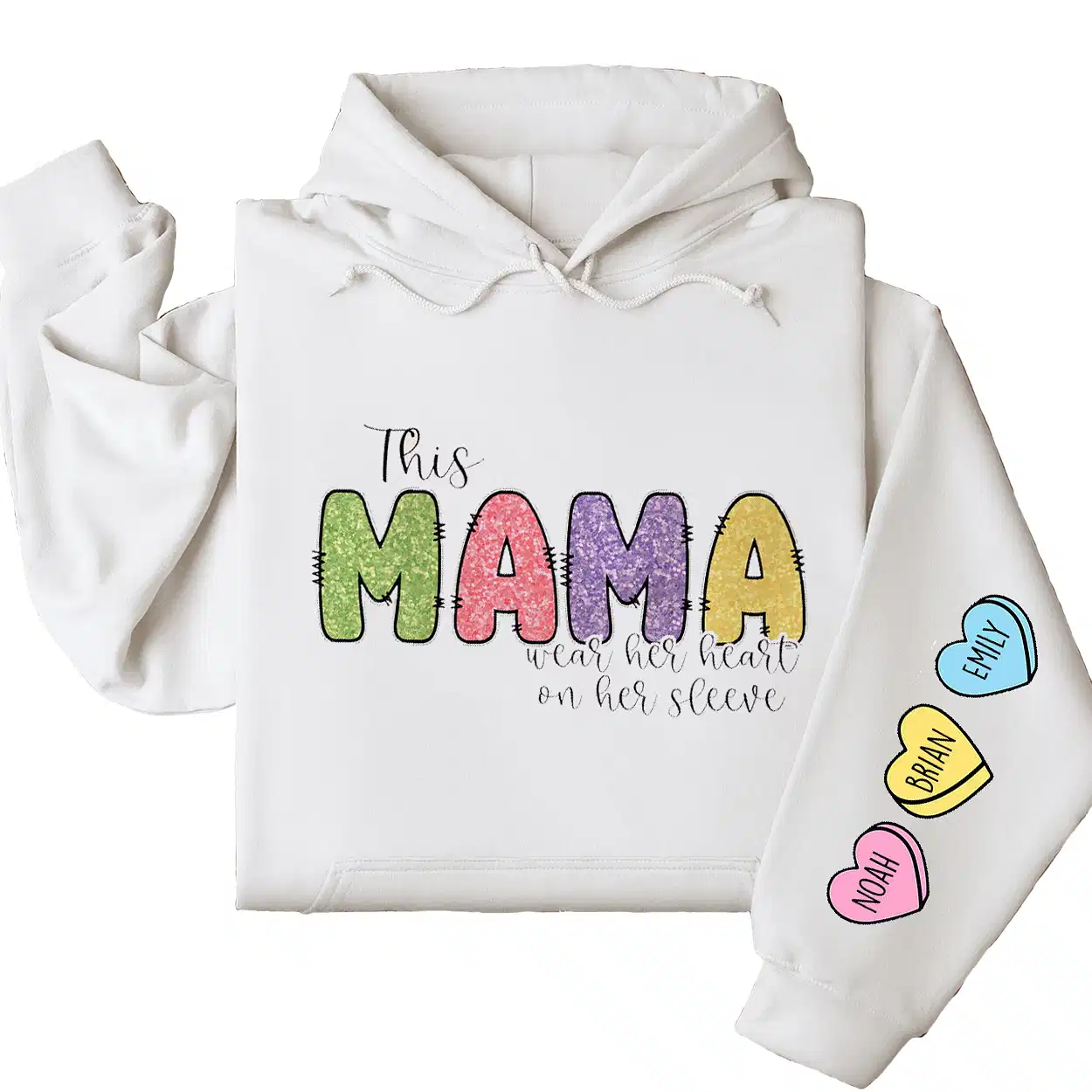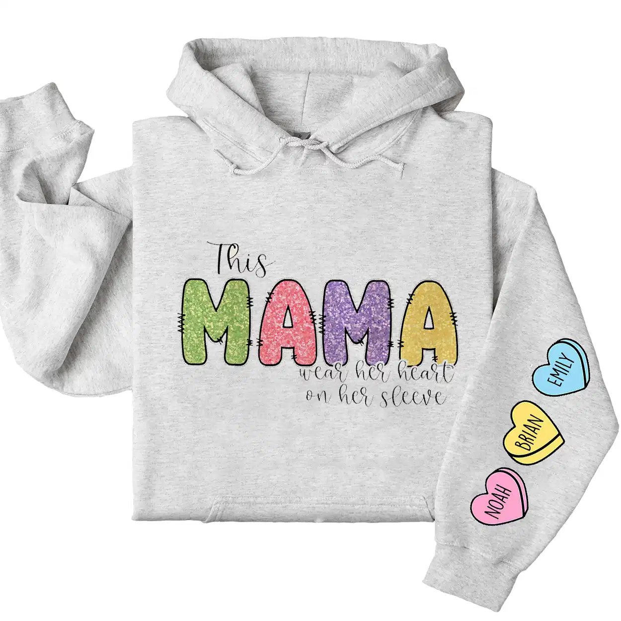 This Mama Wears Her Heart on Her Sleeve Hoodie – Custom Hoodie with Kids’ Names, Personalized Mother’s Day Gift for Mama