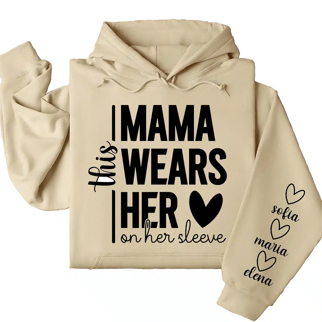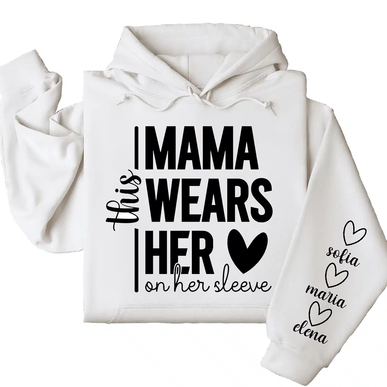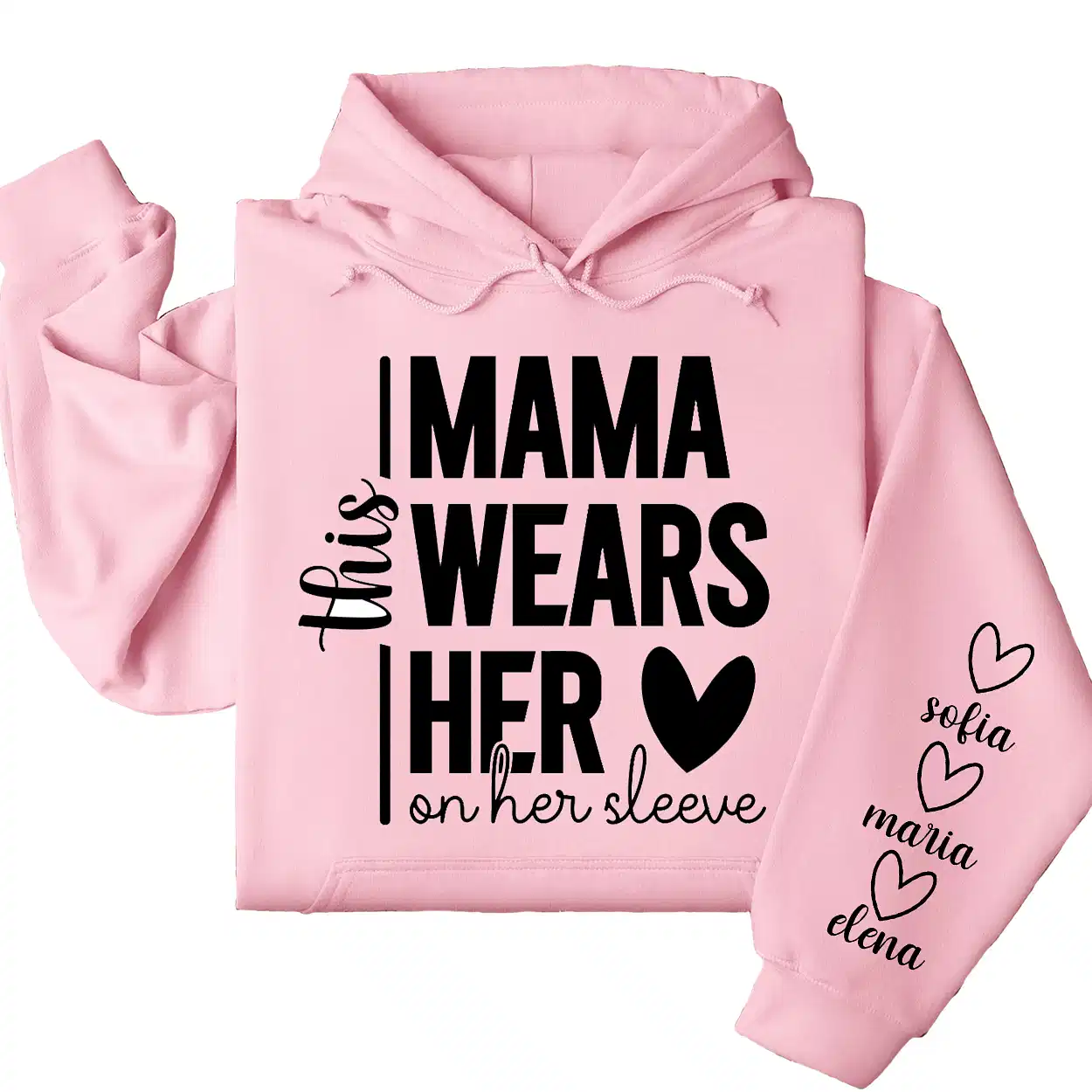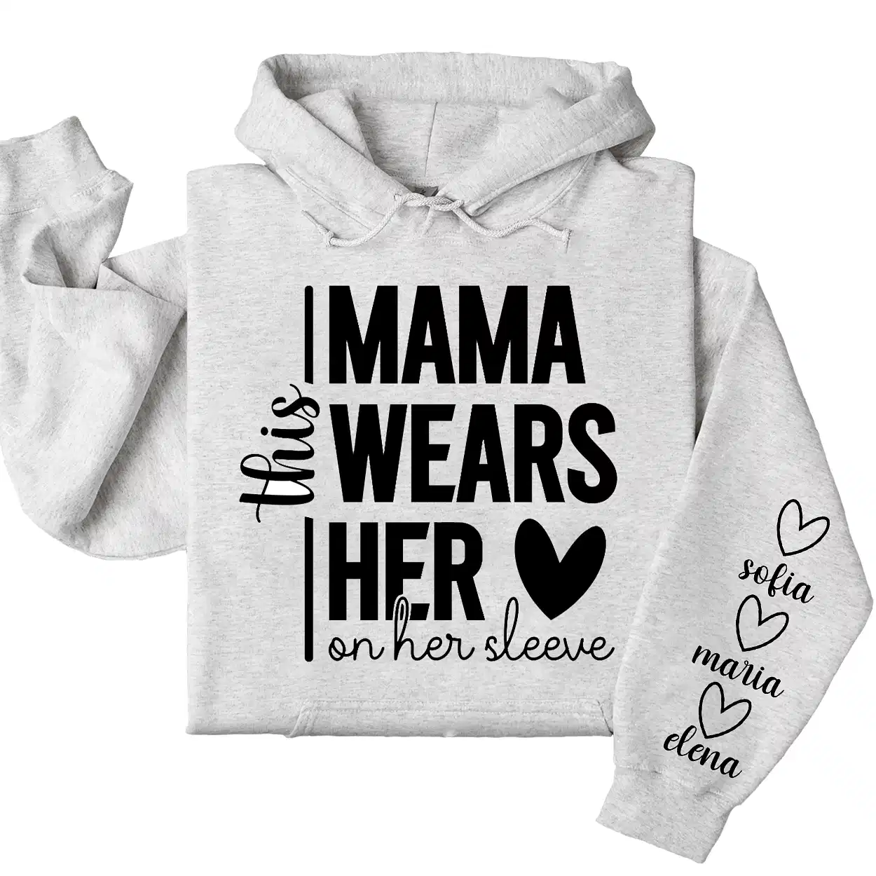 This Mama Wears Her Heart on Her Sleeve Hoodie – Custom Hoodie with Kids’ Names, Personalized Mother’s Day Gift for Mama