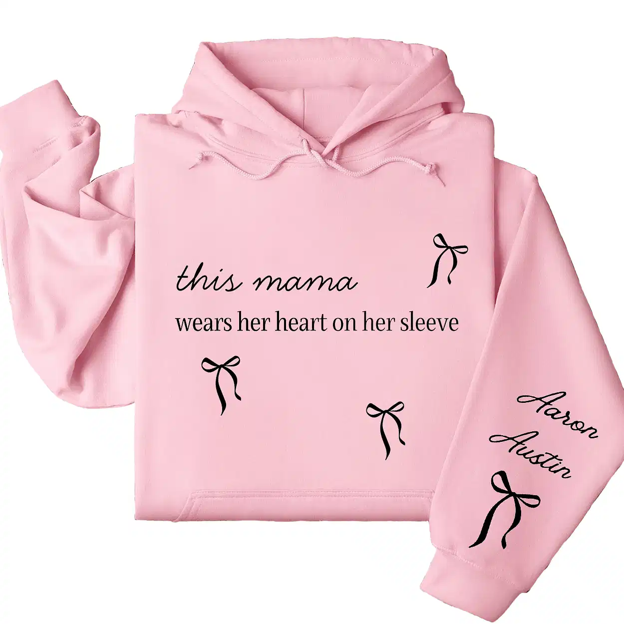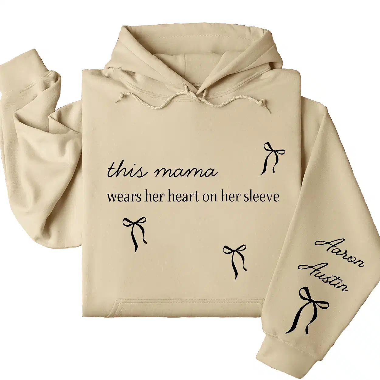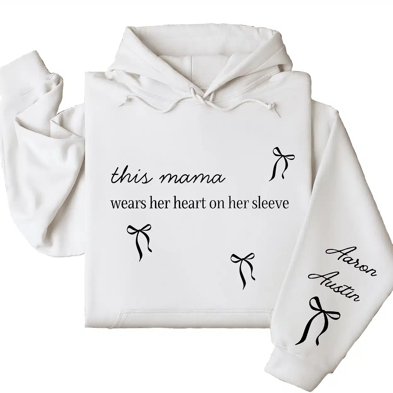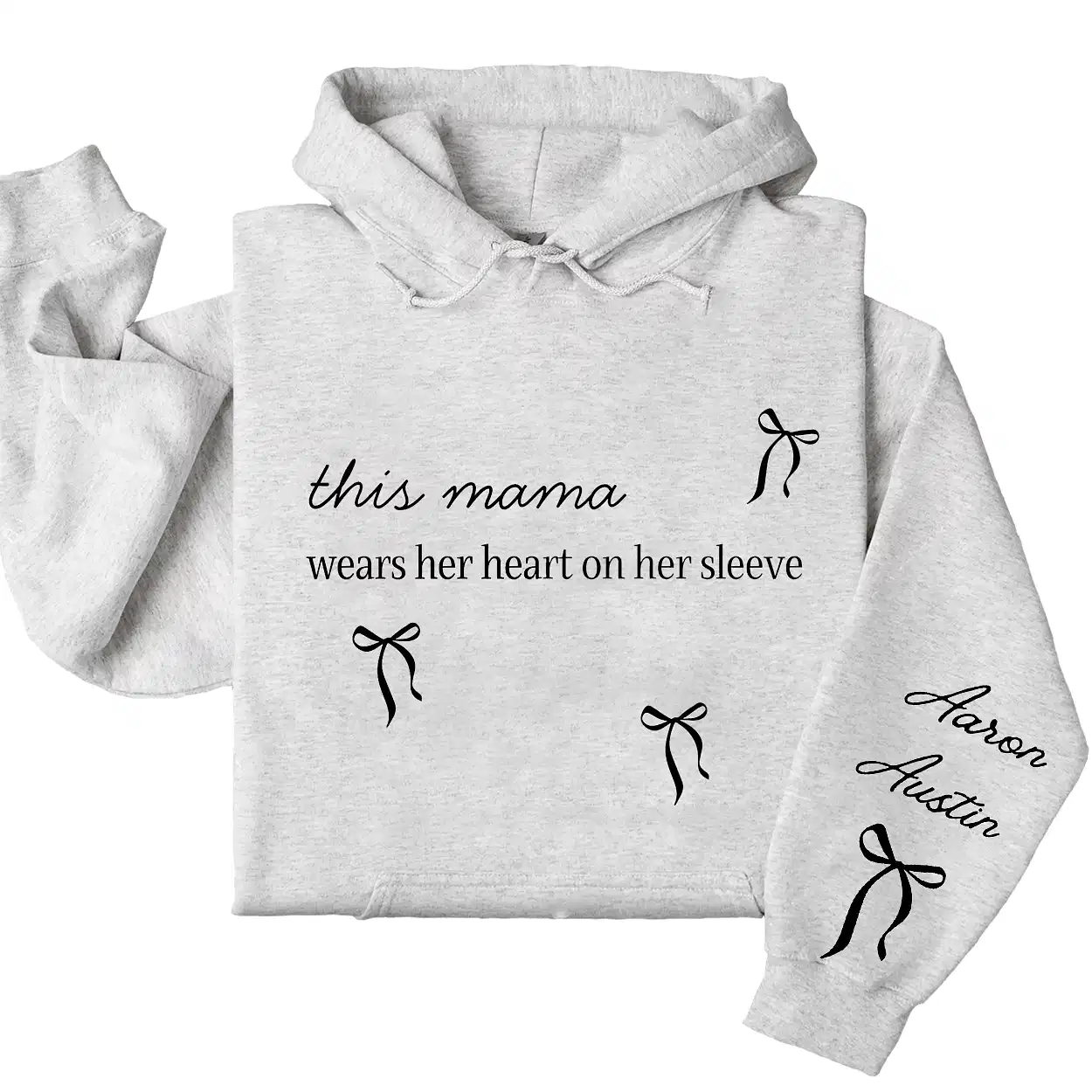 This Mama Wears Her Heart on Her Sleeve Hoodie – Custom Hoodie with Kids’ Names, Personalized Mother’s Day Gift for Mama