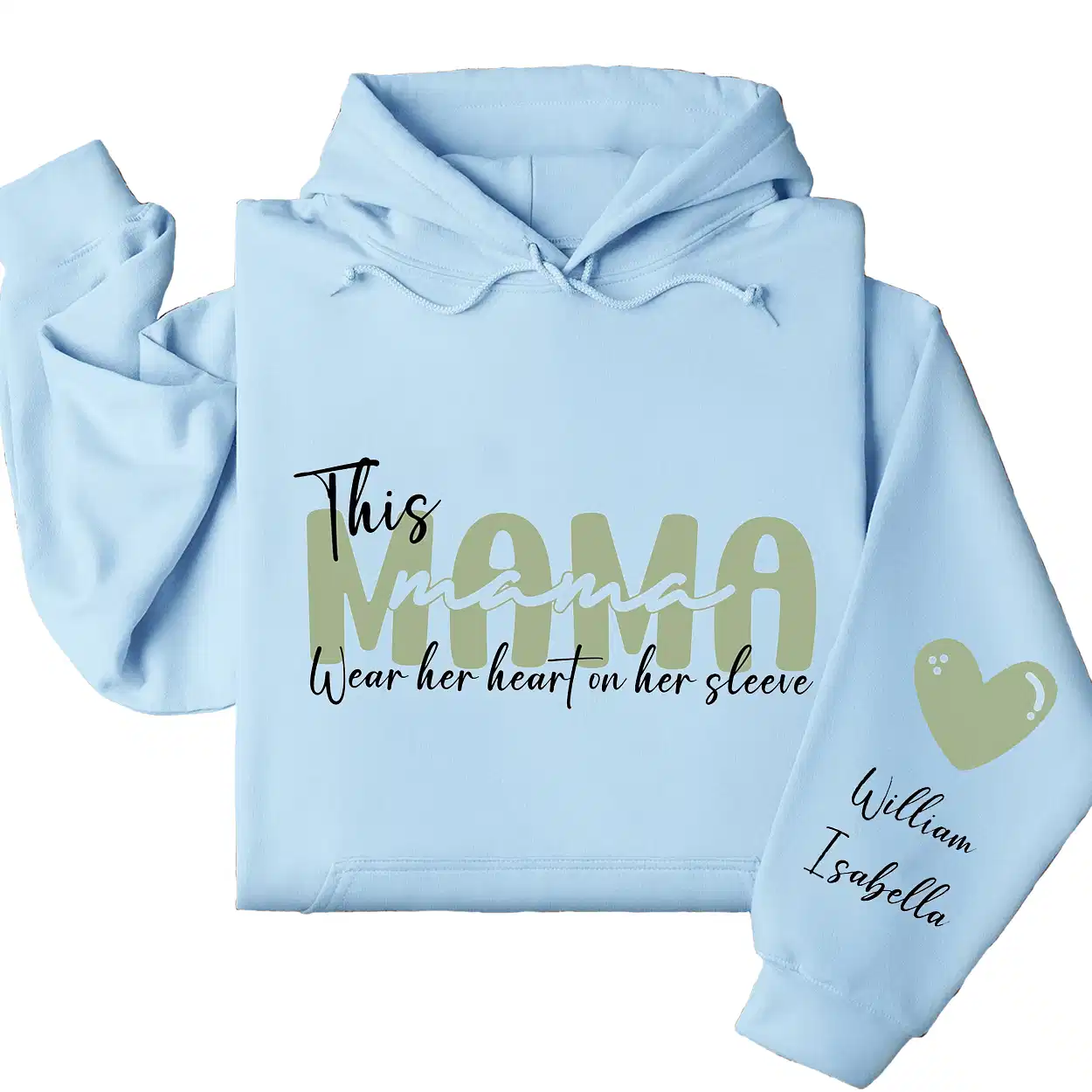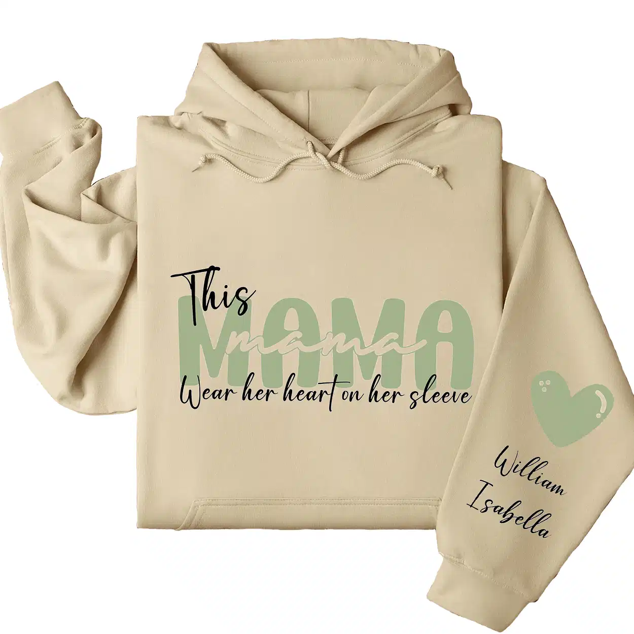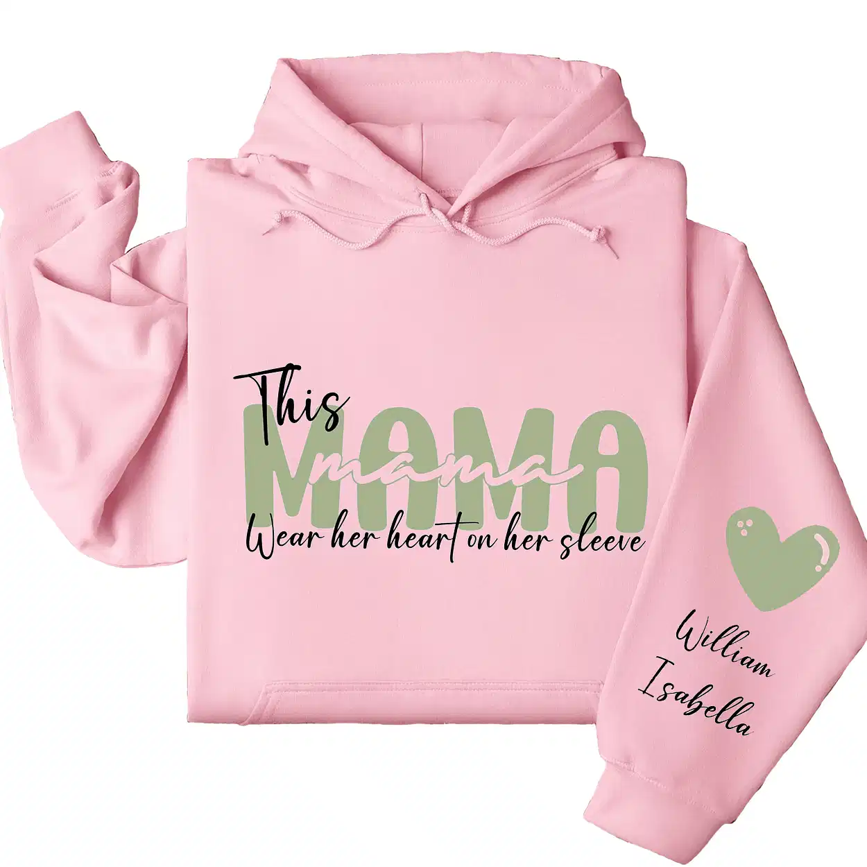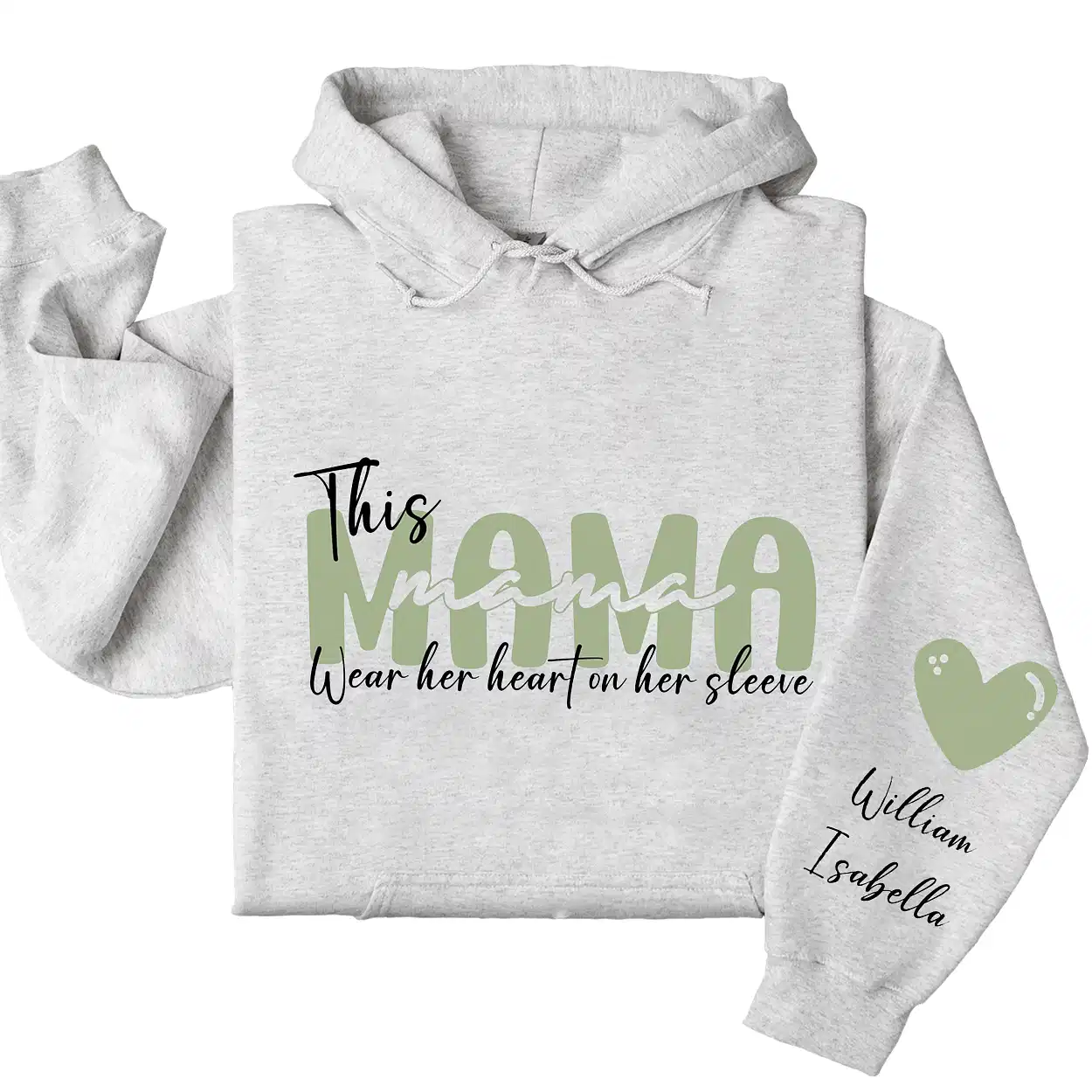 This Mama Wears Her Heart on Her Sleeve Hoodie – Custom Hoodie with Kids’ Names, Personalized Mother’s Day Gift for Mama