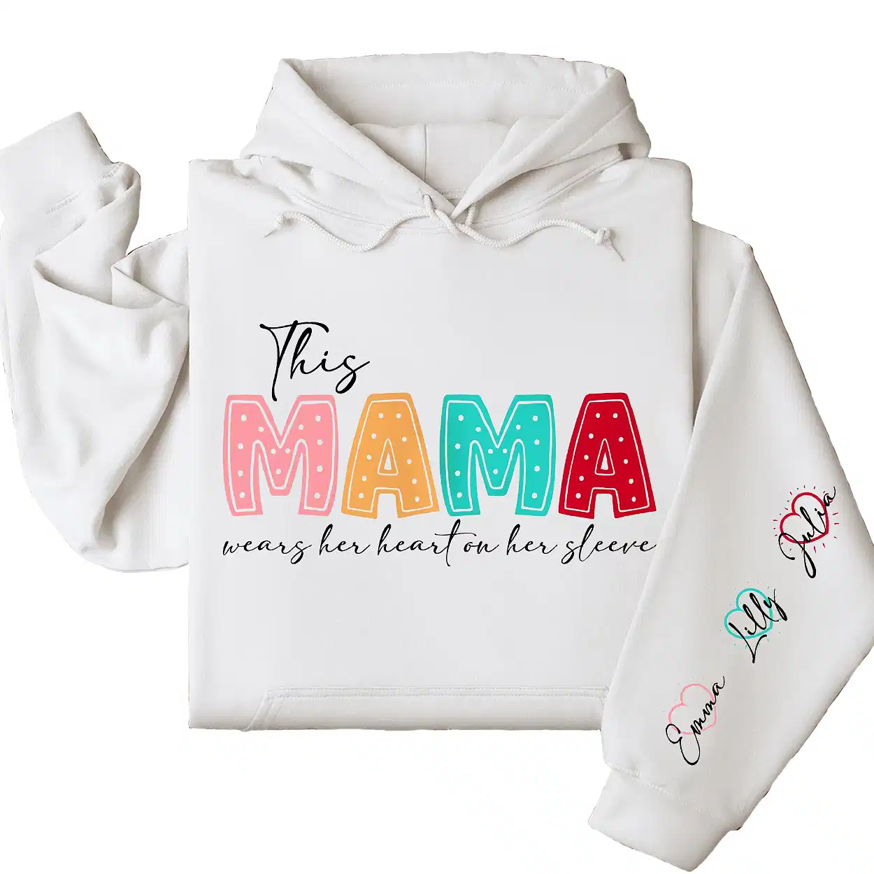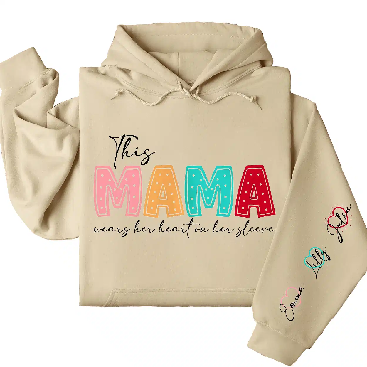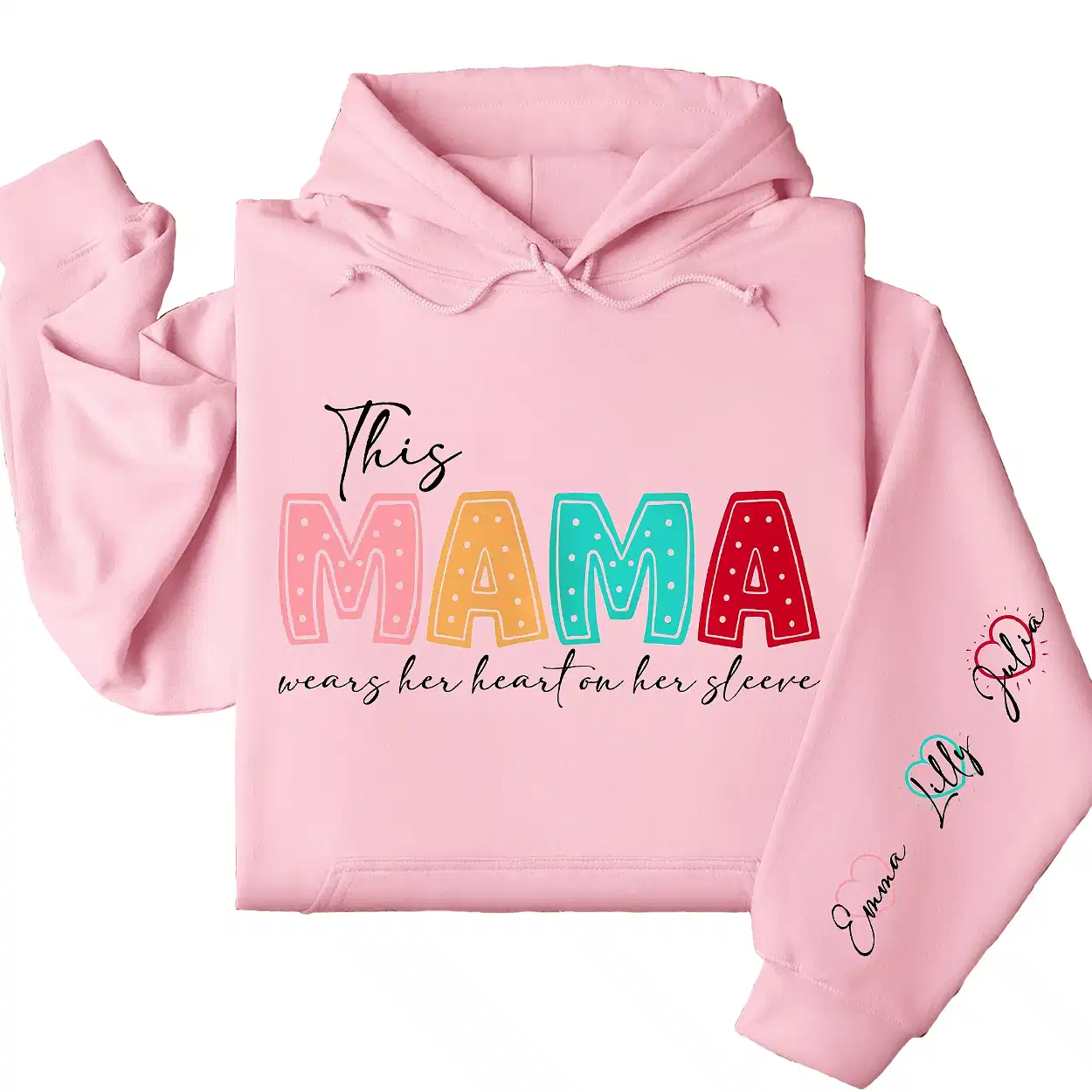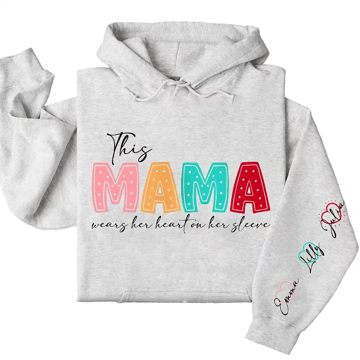 This Mama Wears Her Heart on Her Sleeve Hoodie – Custom Hoodie with Kids’ Names, Personalized Mother’s Day Gift for Mom
