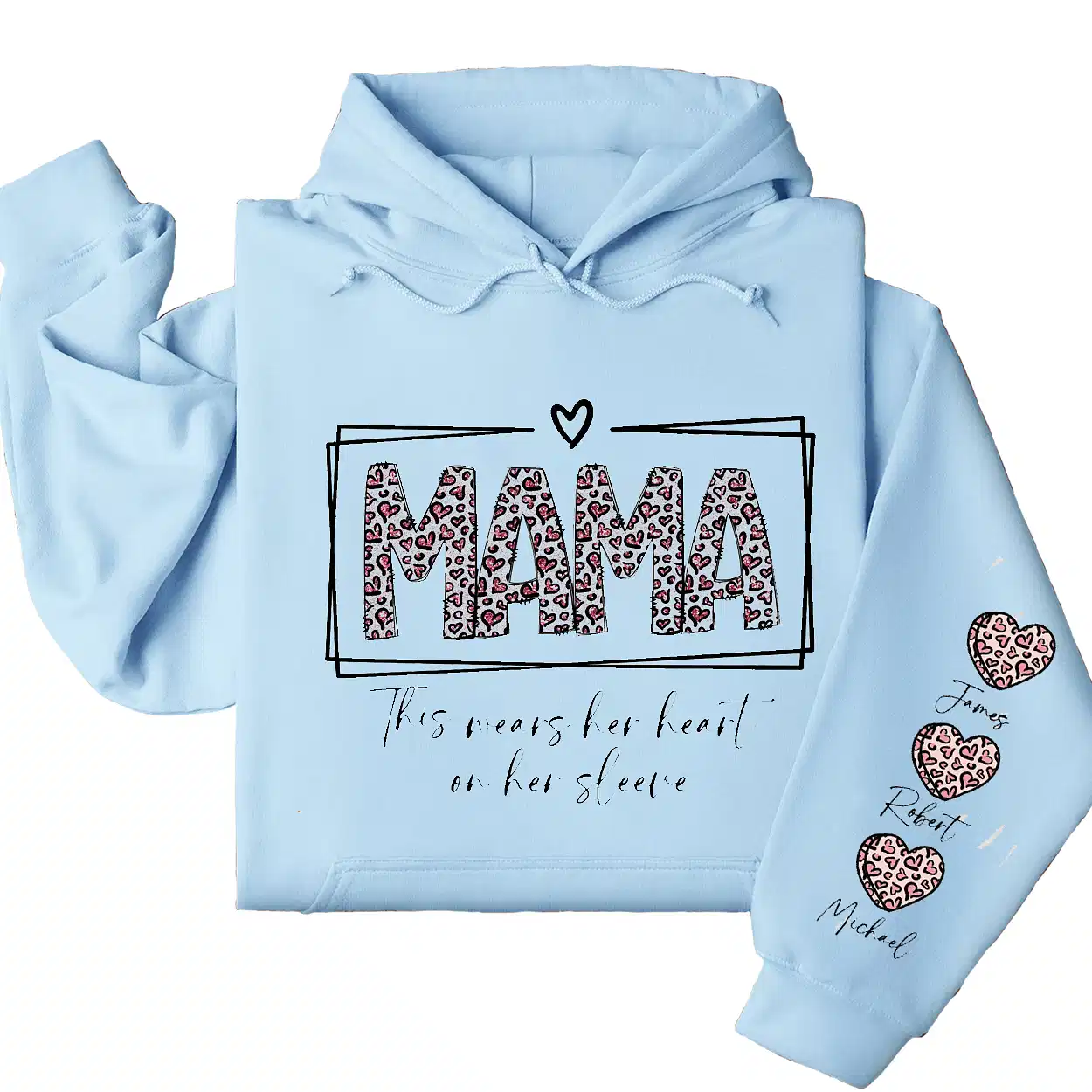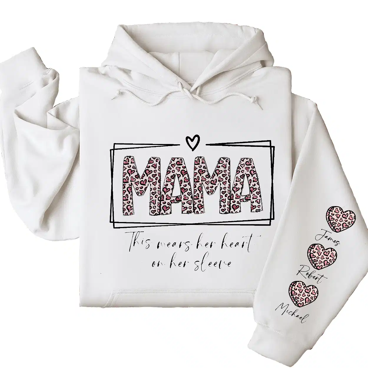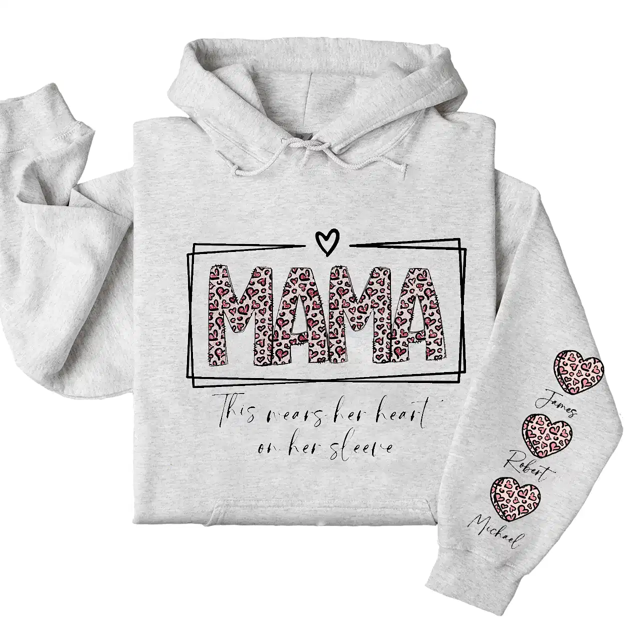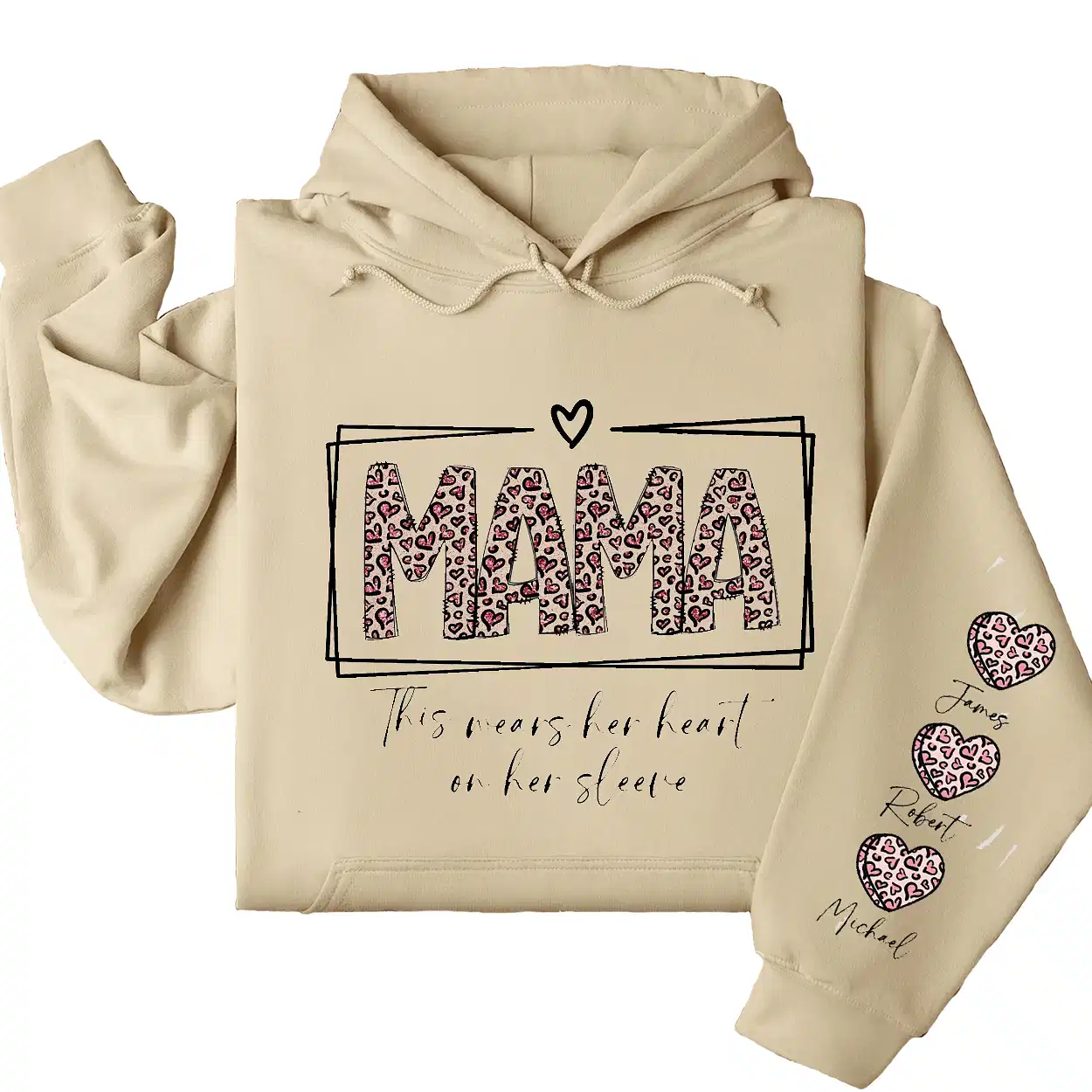 This Mama Wears Her Heart on Her Sleeve Hoodie – Custom Hoodie with Kids’ Names, Personalized Mother’s Day Gift for Mom