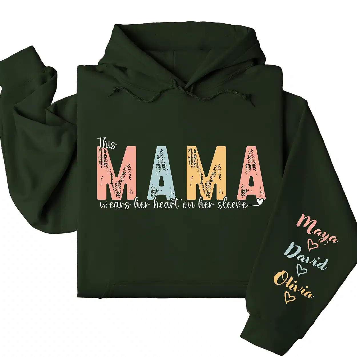 This Mama Wears Her Heart on Her Sleeve Hoodie – Custom Hoodie with Kids’ Names, Personalized Mother’s Day Gift for Mom