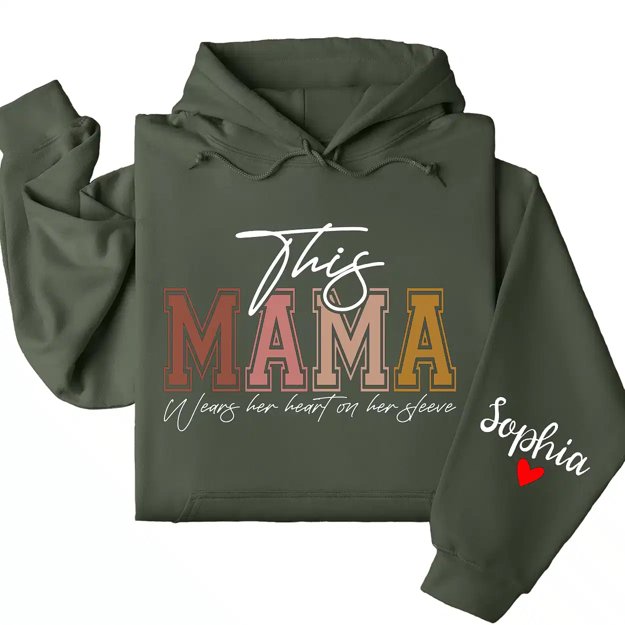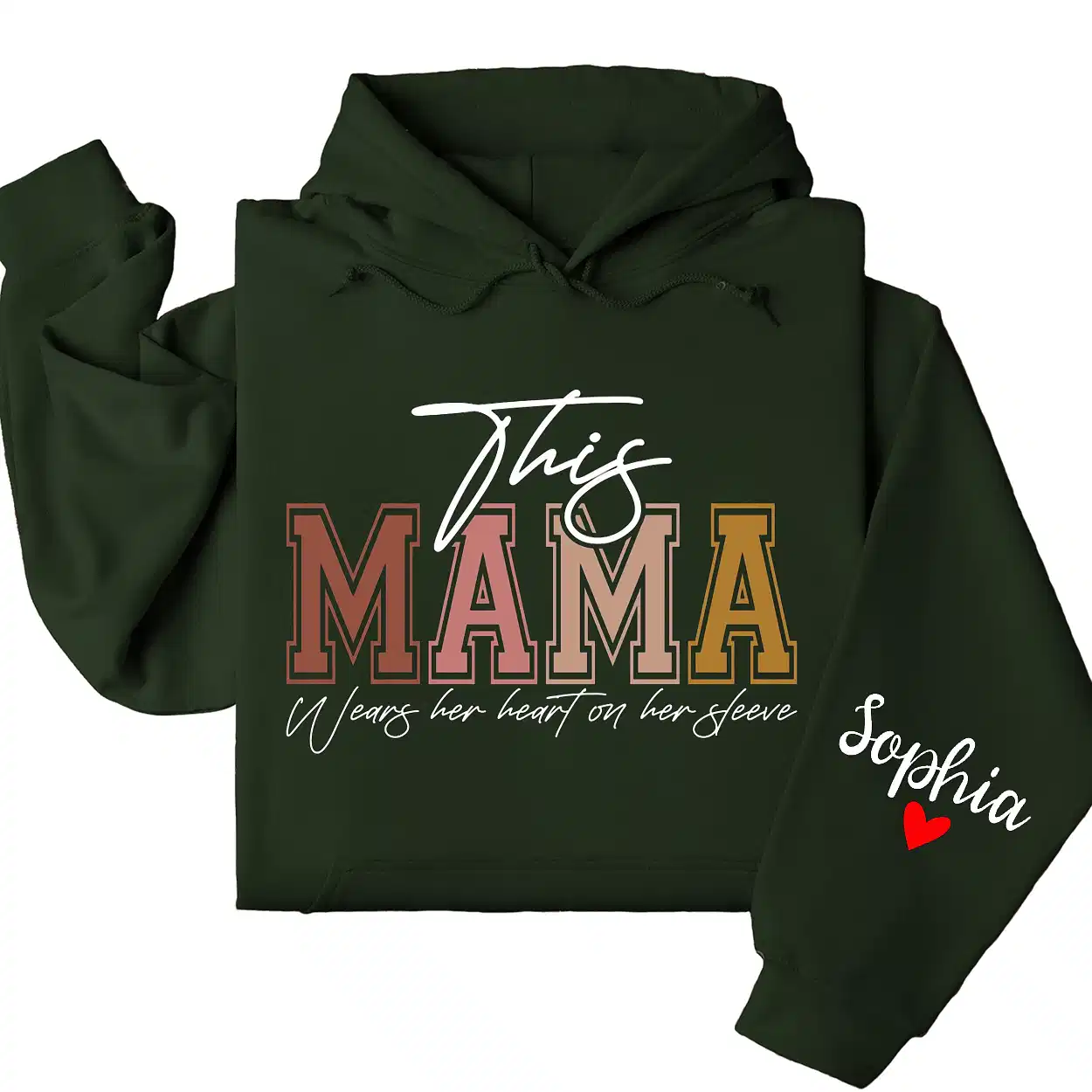 This Mama Wears Her Heart on Her Sleeve Hoodie – Custom Mom Hoodie with Kids’ Names, Personalized Mother’s Day Gift, Thoughtful Mama Outfit