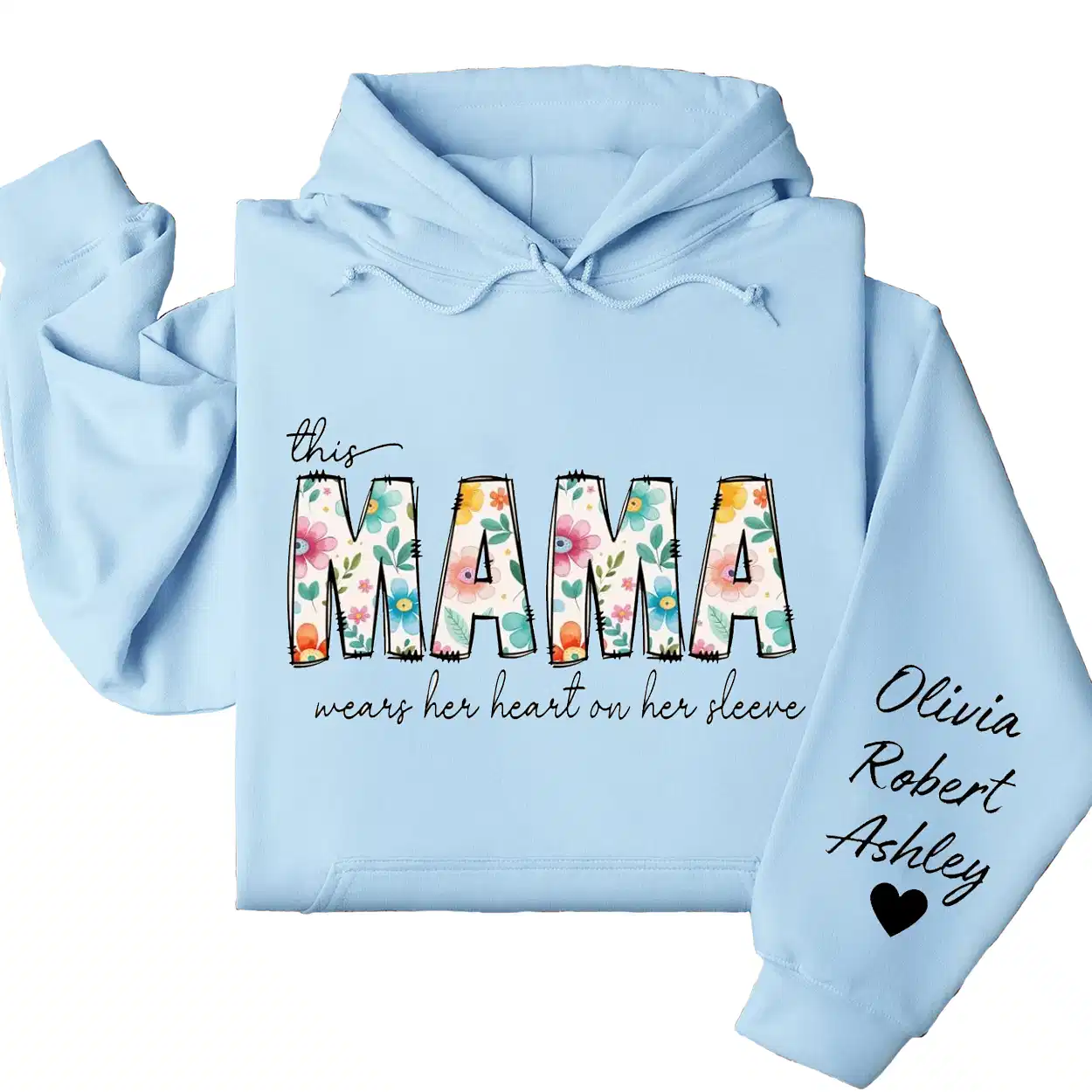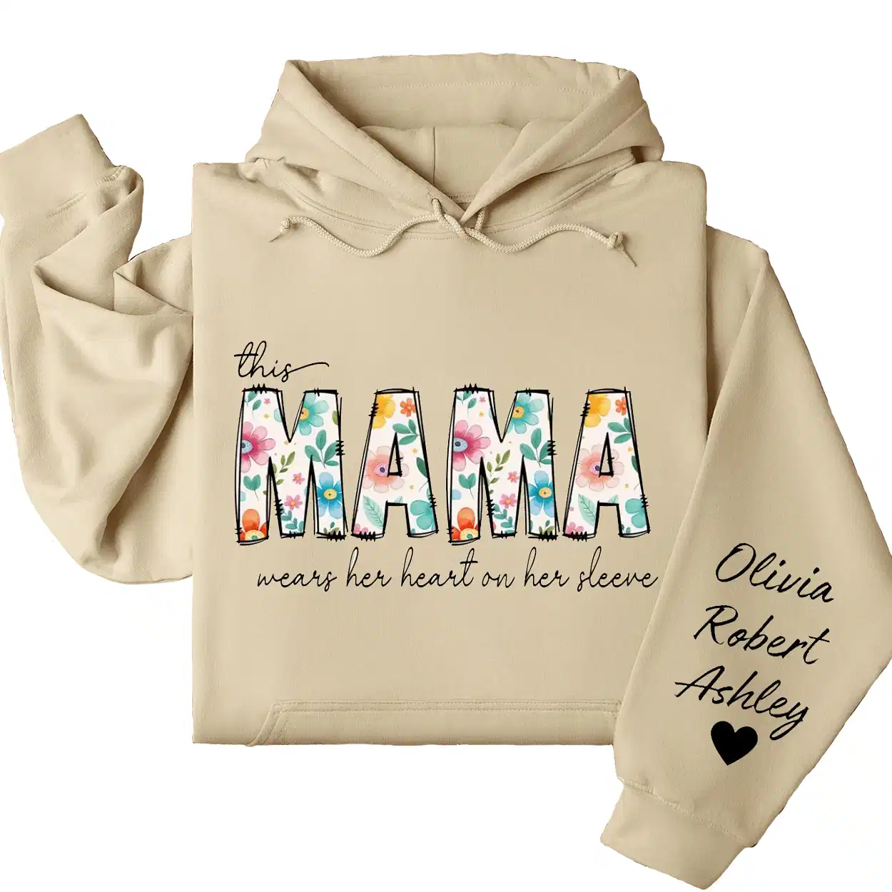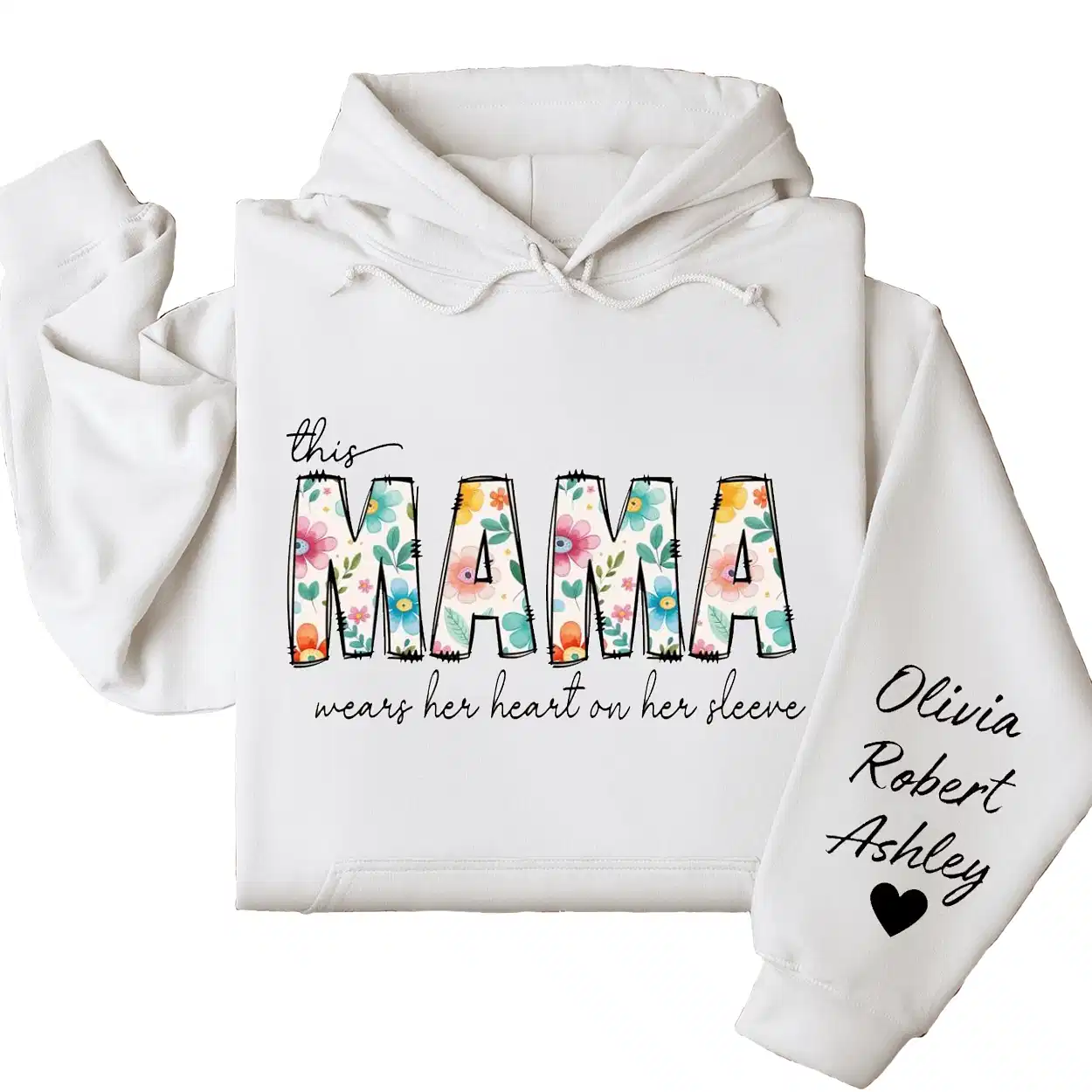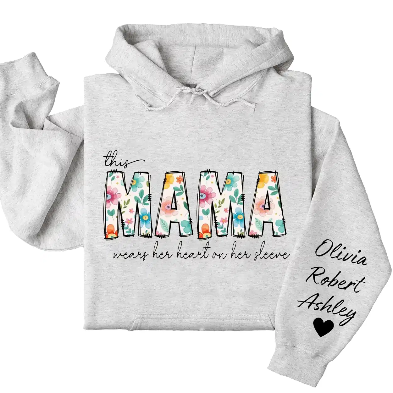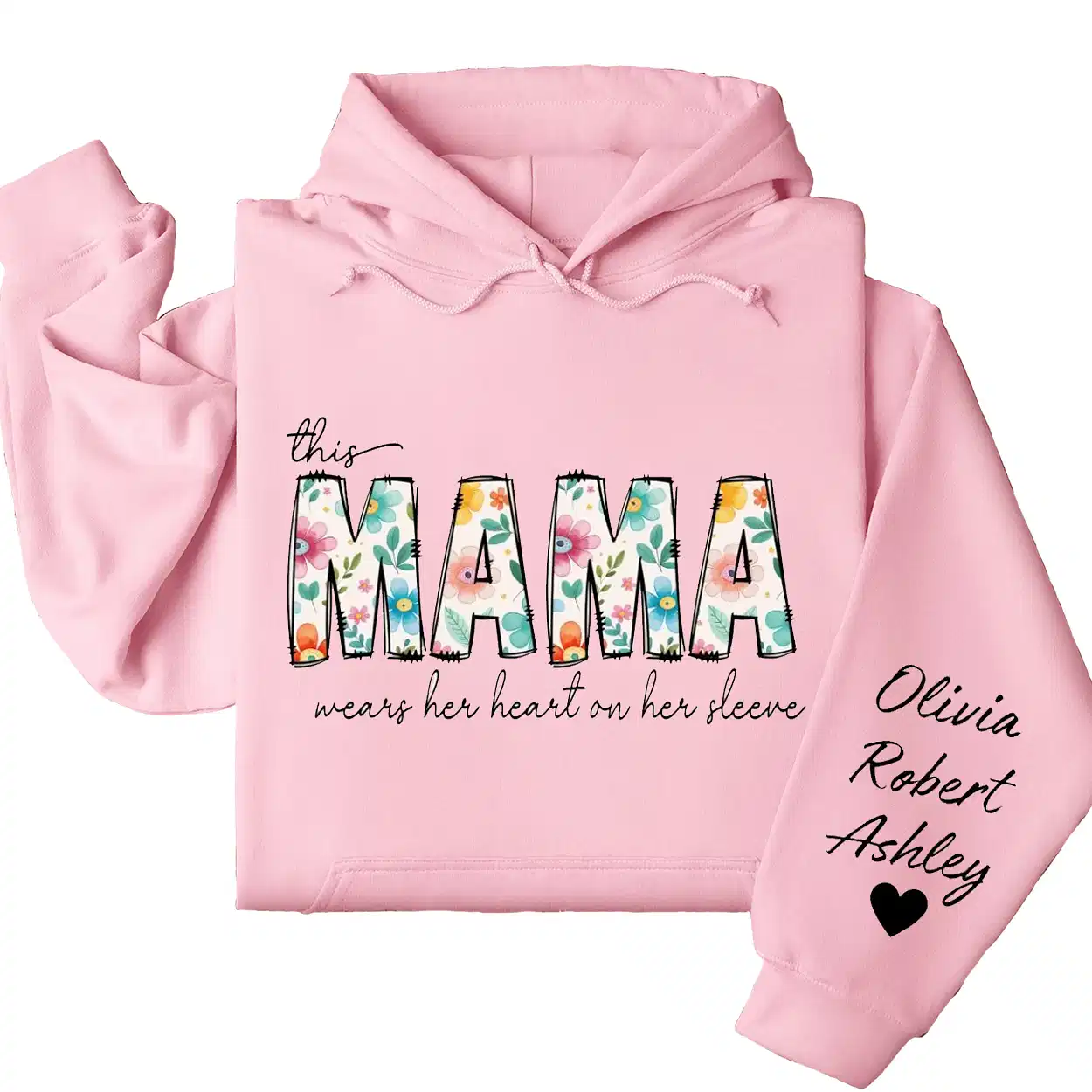 This Mama Wears Her Heart on Her Sleeve Hoodie – Custom Mom Sweatshirt with Kids’ Names, Floral Design, Trendy Mother’s Day Gift Idea