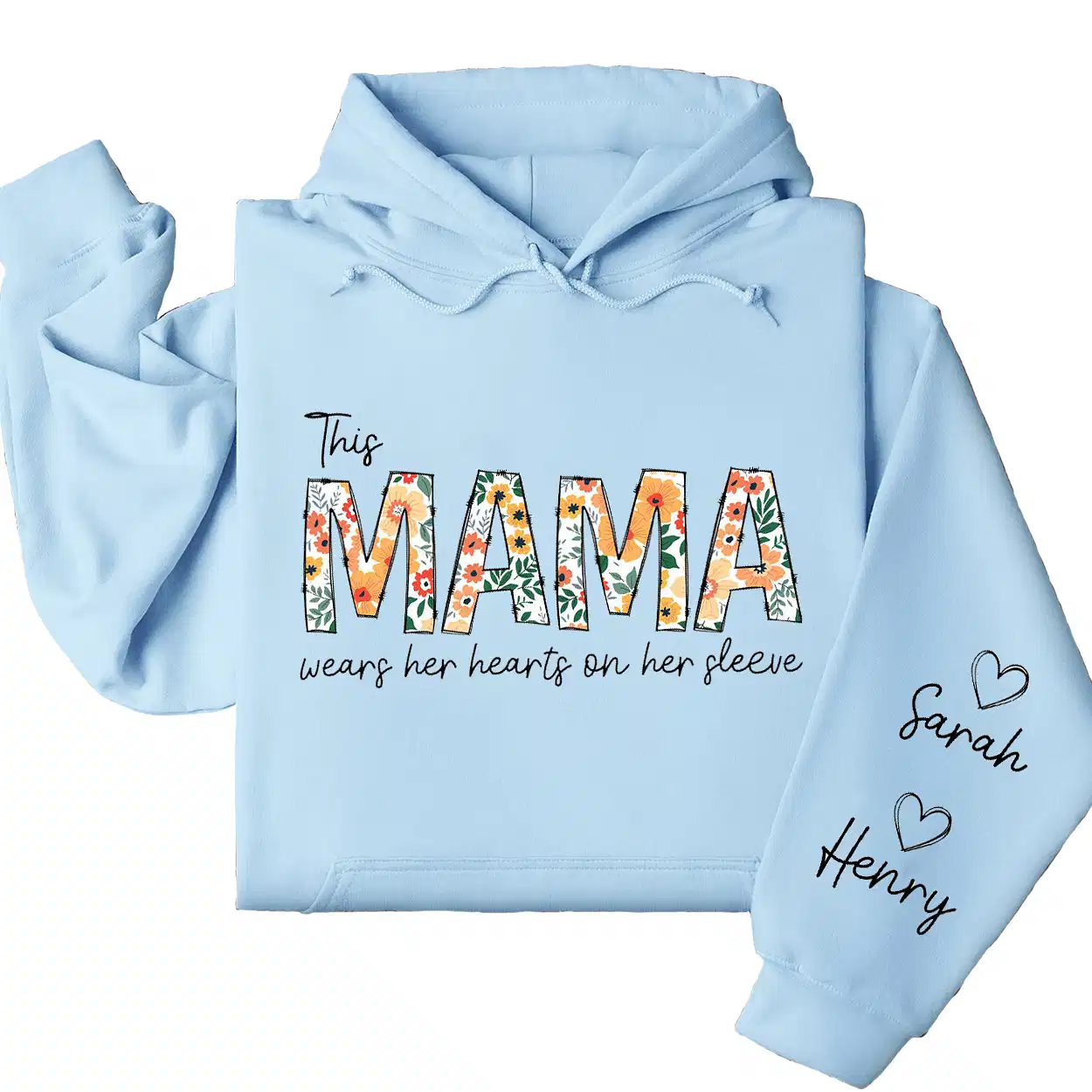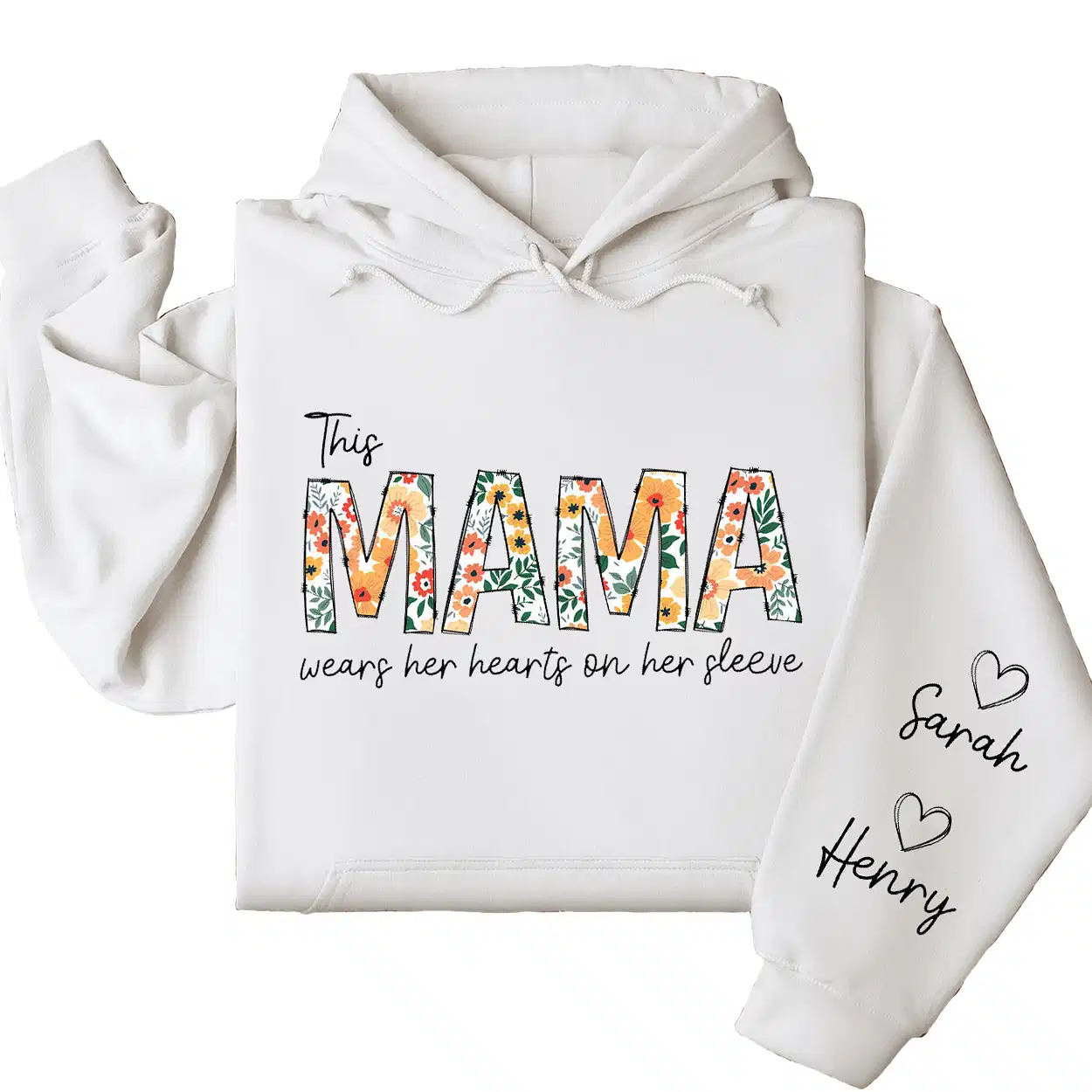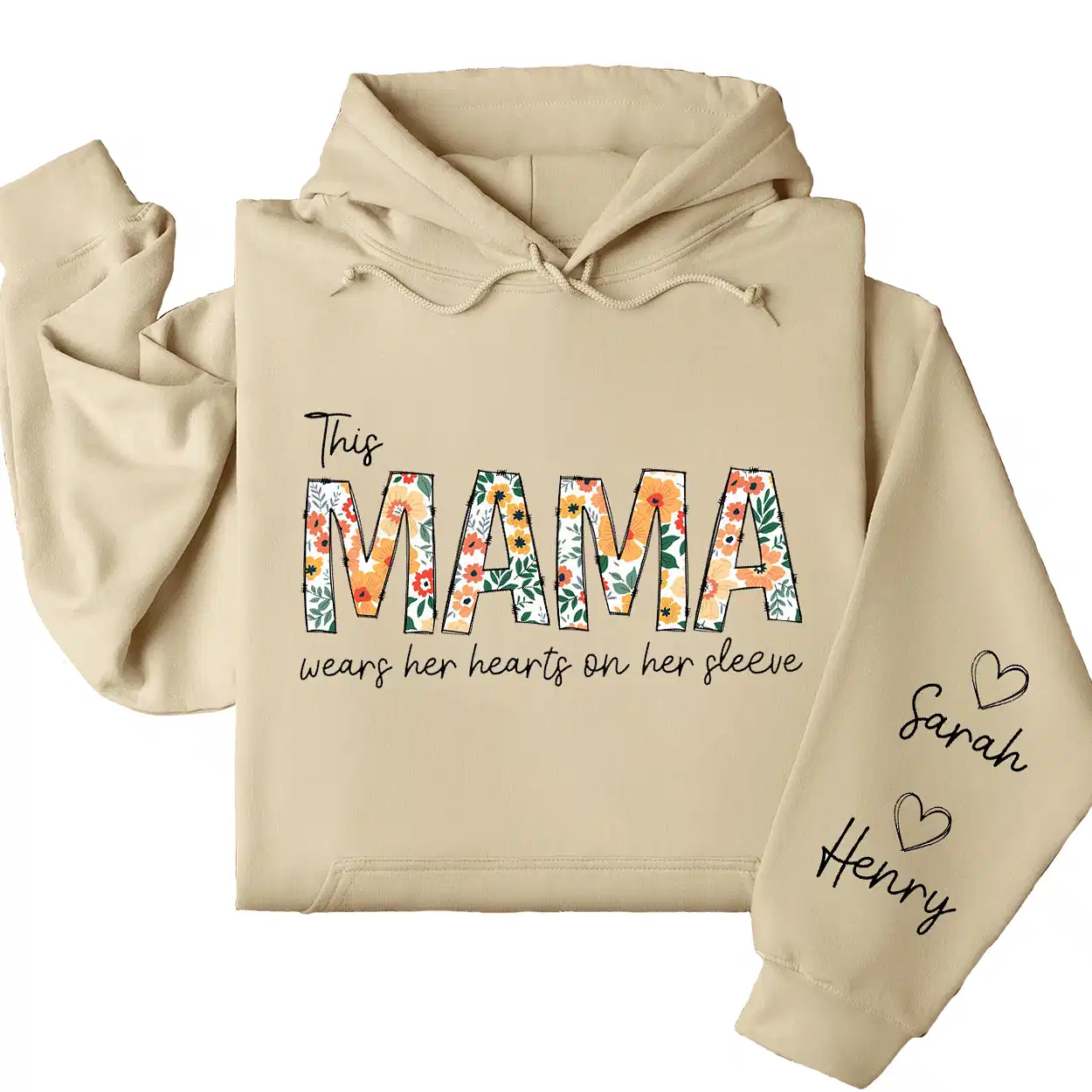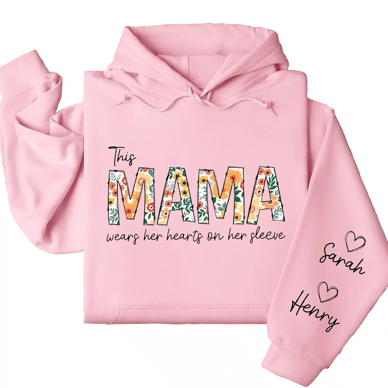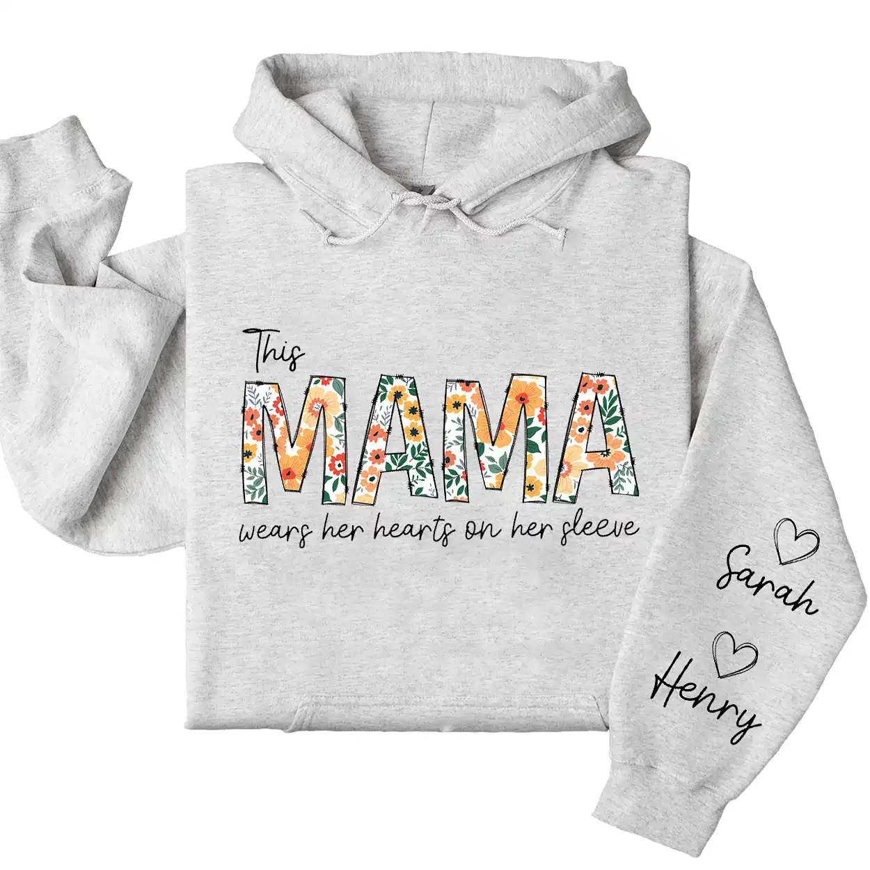 This Mama Wears Her Heart on Her Sleeve Hoodie – Floral Mama, Custom Hoodie with Kids’ Names, Personalized Mother’s Day Gift for Mama