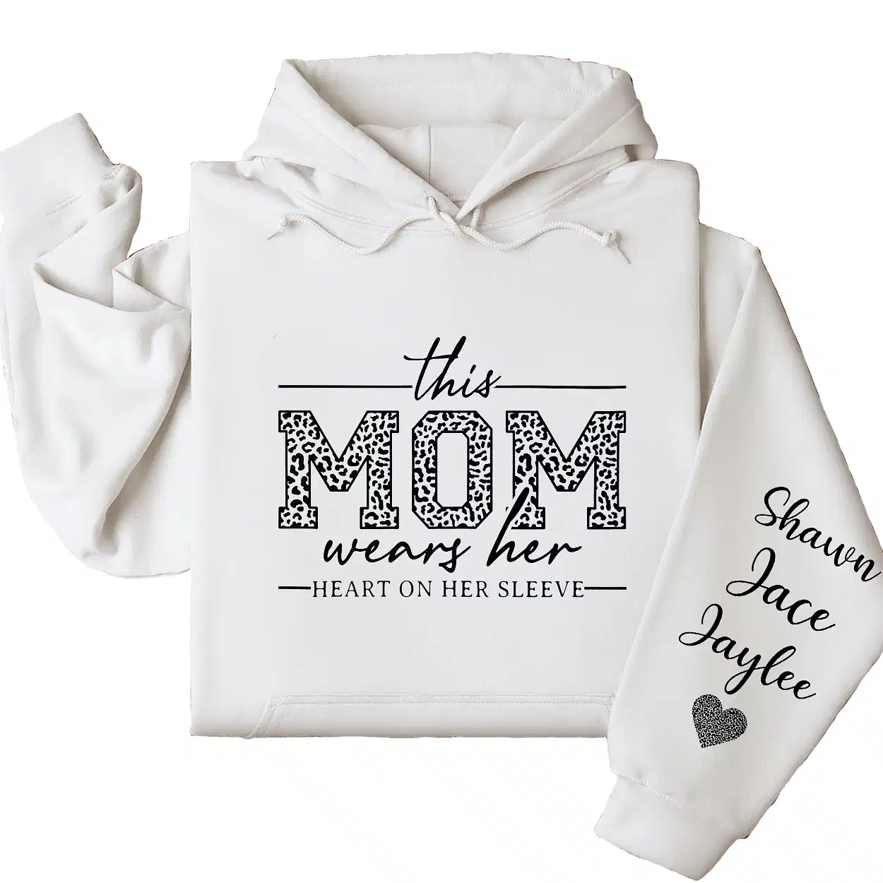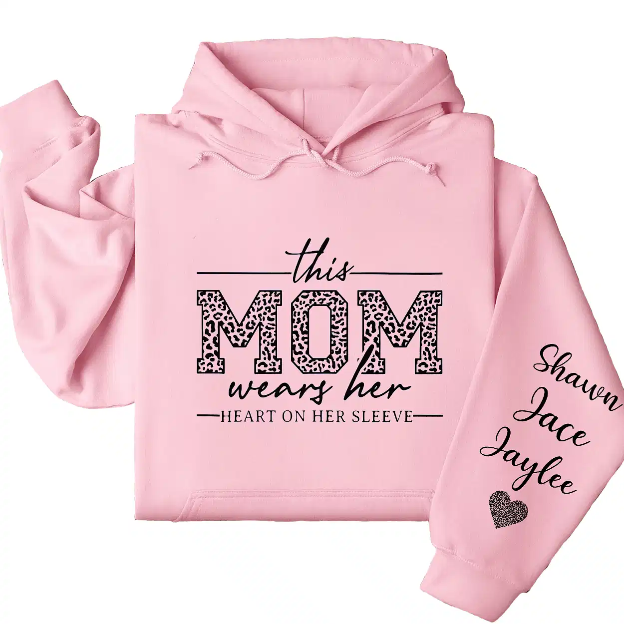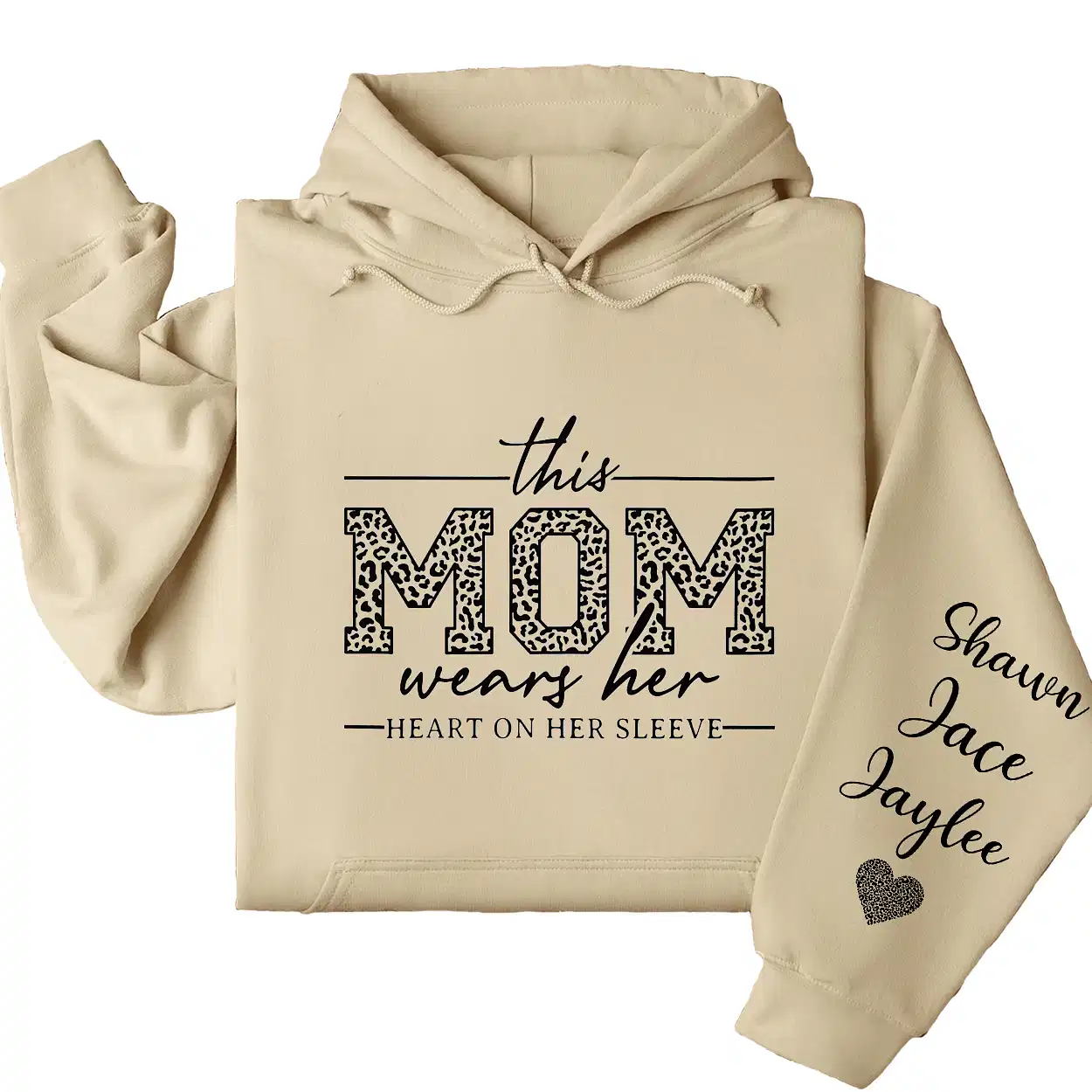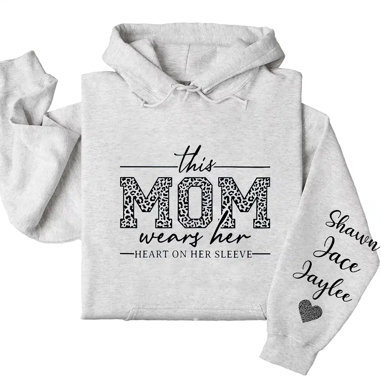 This Mom Wears Her Heart on Her Sleeve Hoodie – Personalized Mom Life Shirt with Kids’ Names, Mother’s Day Gift, Cute Blessed Mama Tee