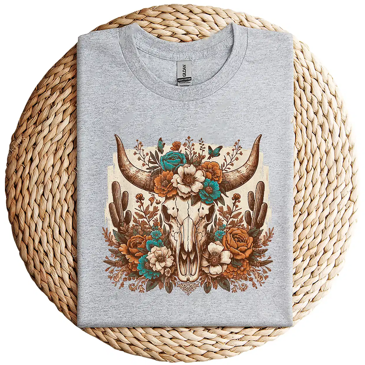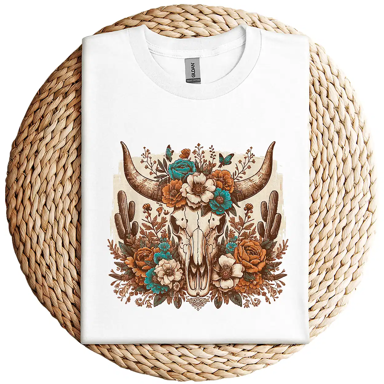 Western Boho Cow Bull Skull T-Shirt – Wild West Floral Graphic Tee – Country Style Vintage Shirt – Rodeo Cowgirl Southwestern Design
